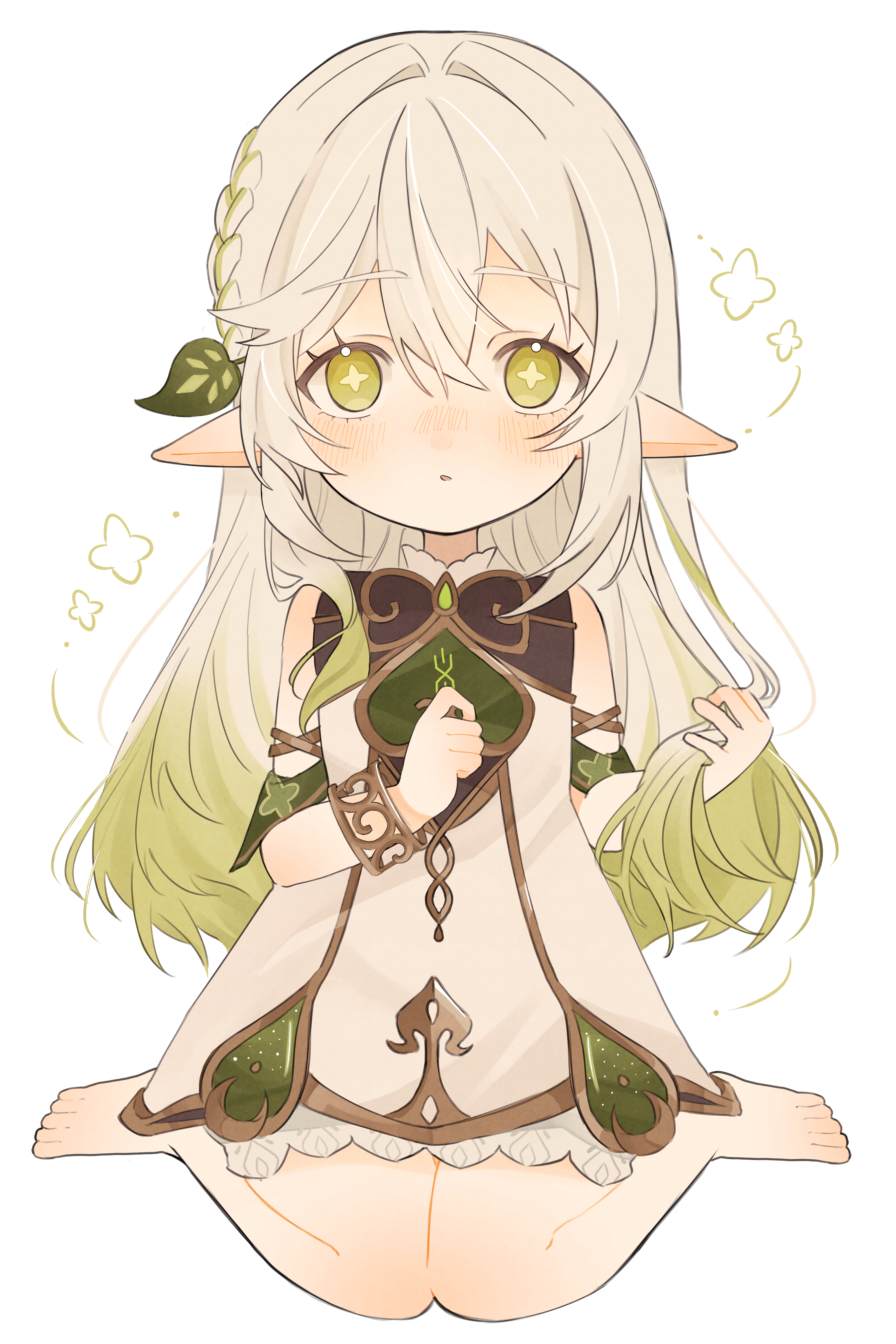 absurdres alternate_hairstyle bare_legs barefoot bloomers blush braid genshin_impact green_eyes highres kumane_(osakanadonn) long_hair multicolored_hair nahida_(genshin_impact) pointy_ears sitting sleeveless symbol-shaped_pupils underwear wariza white_background white_bloomers wrist_cuffs