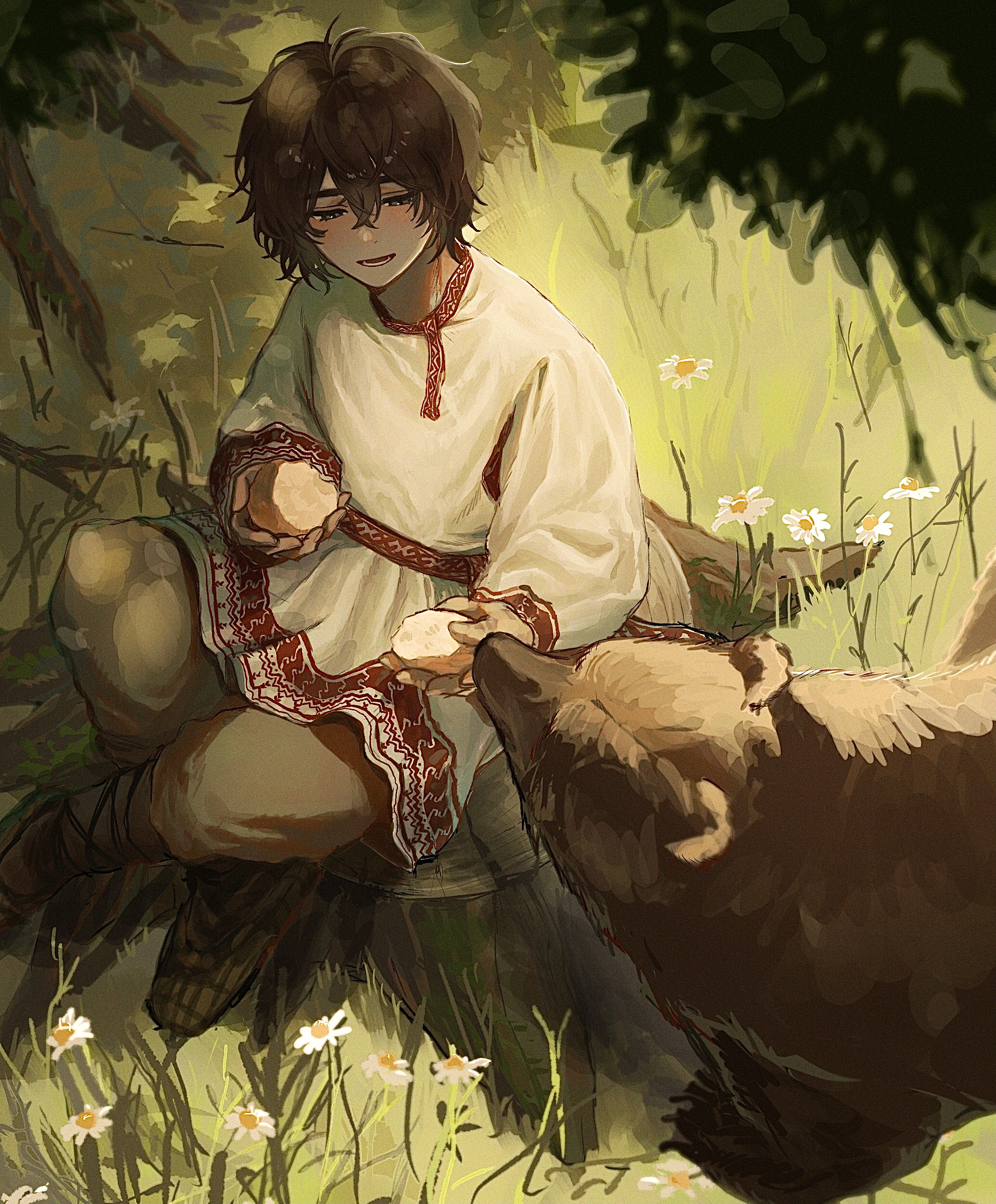 1boy absurdres aged_down bear brown_hair daisy_(flower) flower food forest grass green_theme highres holding holding_food nature open_mouth original personification russia_(saboten92) saboten92 sharing_food sitting smile solo tree tree_stump