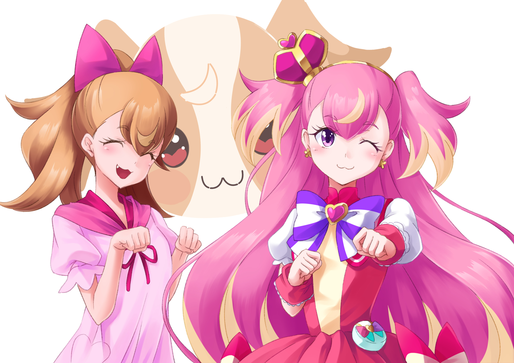 1girl :3 blush bow bowtie brooch brown_hair closed_eyes closed_mouth crown cure_wonderful dress earrings fang hair_bow heart heart_brooch highres hooded_dress inukai_komugi inukai_komugi_(dog) jewelry long_hair magical_girl mini_crown multicolored_hair one_eye_closed open_mouth pink_bow pink_dress pink_hair ponytail precure puffy_short_sleeves puffy_sleeves purple_eyes red_dress shiruppo short_sleeves smile solo streaked_hair striped_bow striped_bowtie striped_clothes two-tone_hair two_side_up very_long_hair white_sleeves wonderful_precure! wrist_cuffs