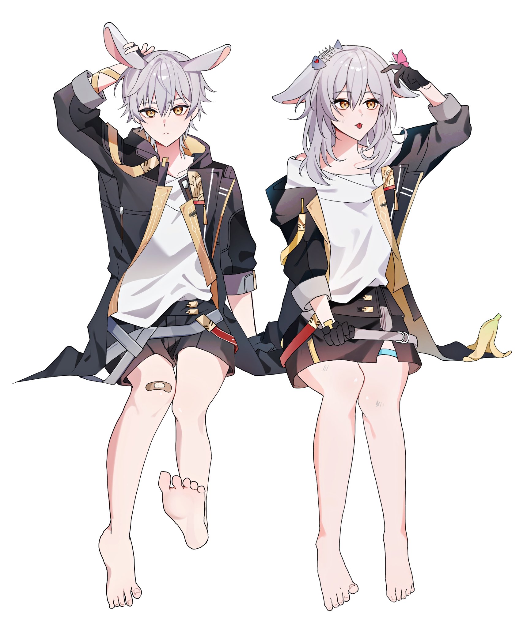 1boy 1girl aged_down animal_ears arm_ribbon arm_up banana_peel bandaid bandaid_on_knee bandaid_on_leg barefoot black_coat black_gloves black_shorts black_skirt bug butterfly caelus_(honkai:_star_rail) closed_mouth coat collarbone dual_persona fingerless_gloves fish_skeleton full_body gloves grey_hair hair_between_eyes highres honkai:_star_rail honkai_(series) hood hooded_coat insect kemonomimi_mode long_hair long_sleeves looking_afar looking_at_viewer off-shoulder_shirt off_shoulder open_clothes open_coat pink_butterfly poi_po12 puffy_long_sleeves puffy_sleeves rabbit_ears ribbon shirt short_hair shorts simple_background single_bare_shoulder sitting skirt stelle_(honkai:_star_rail) t-shirt thigh_strap tongue tongue_out trailblazer_(honkai:_star_rail) two-sided_coat two-sided_fabric white_background white_shirt yellow_coat yellow_eyes