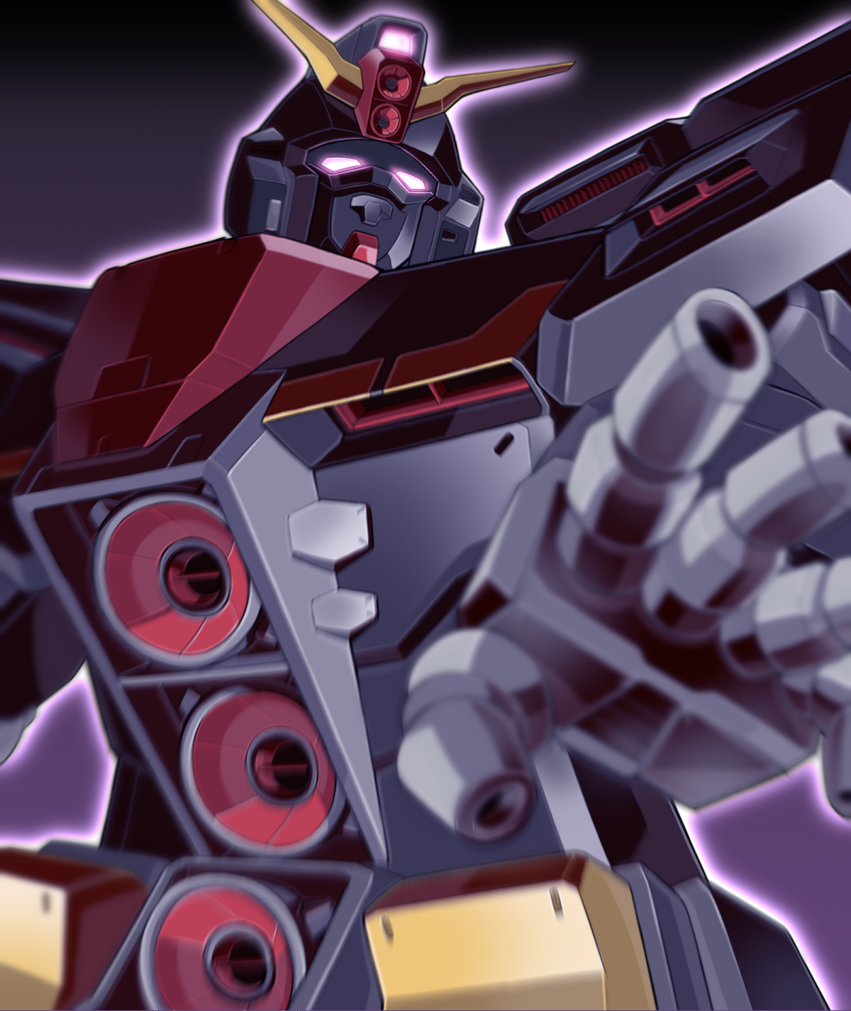 beam_cannon blurry blurry_foreground chest_cannon commentary_request daigosan_(k66daigensui) derivative_work energy finger_cannon glowing glowing_eyes gundam highres machinery mecha mecha_focus mobile_suit no_humans psycho_gundam purple_eyes robot science_fiction titans_(gundam) upper_body v-fin weapon zeta_gundam