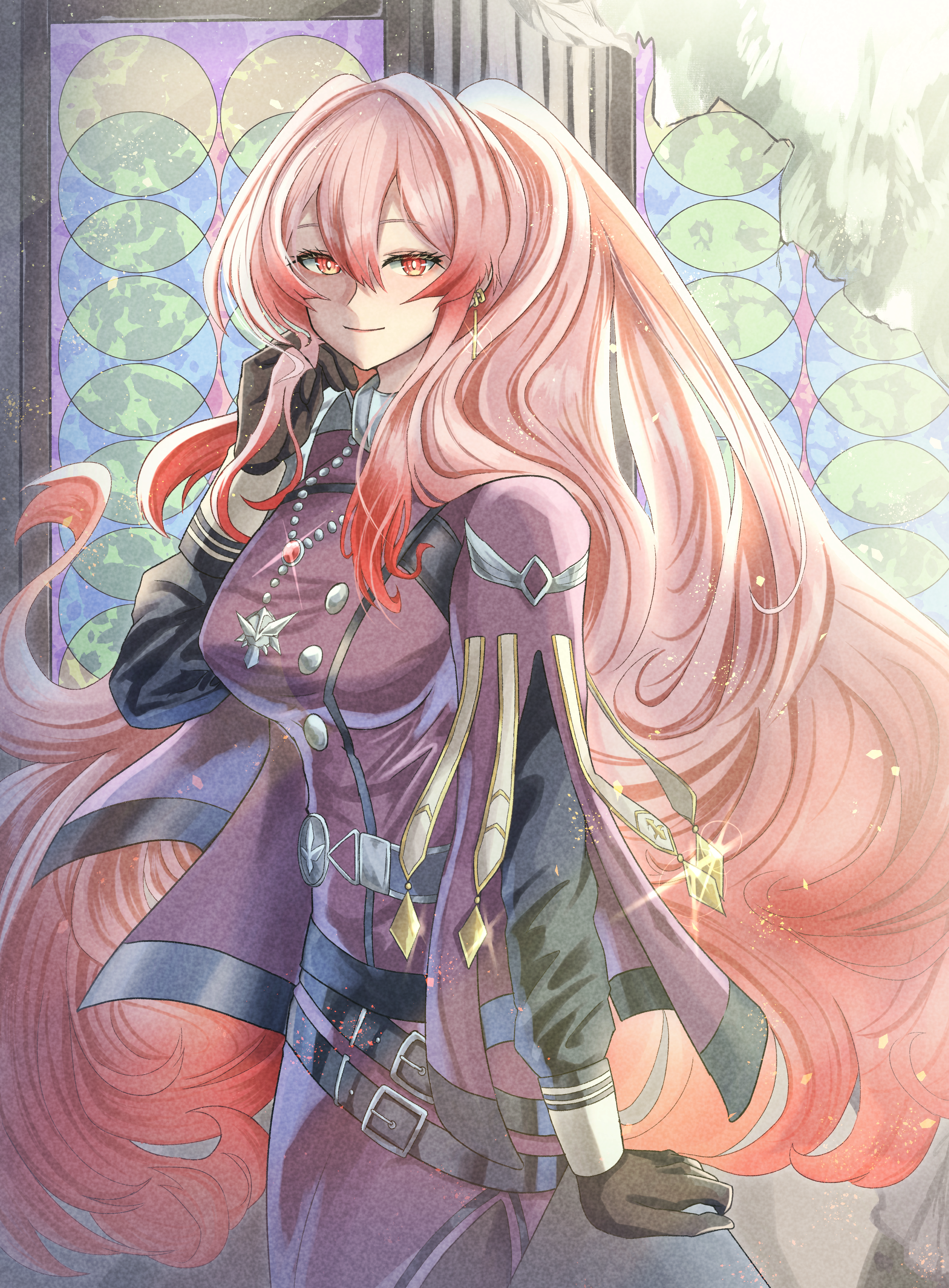 1girl absurdres bead_necklace beads belt belt_buckle black_belt black_gloves black_pantyhose broken_glass buckle commentary curly_hair dress duel_monster earrings exosister_martha gem glass gloves hair_intakes hand_in_own_hair highres jewelry kokorokorokoro417 long_hair necklace pantyhose pink_eyes purple_dress red_gem ruins sidelocks smile solo sparkle stained_glass standing swept_bangs very_long_hair yellow_gem yu-gi-oh!