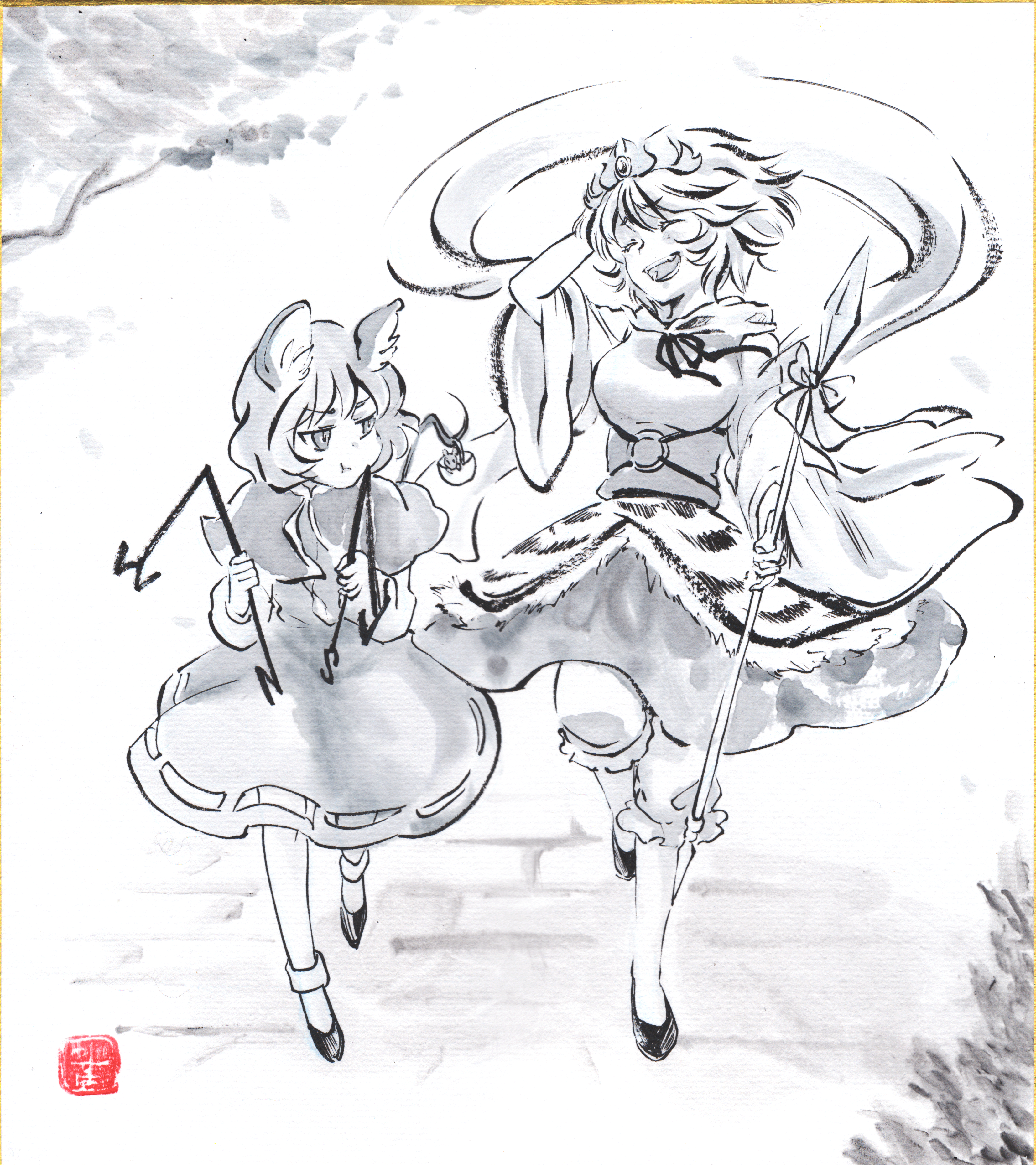 2girls absurdres animal_ears bad_id bad_pixiv_id breasts capelet closed_mouth dowsing_rod dress full_body greyscale highres holding holding_staff long_sleeves looking_at_another medium_breasts medium_hair monochrome mouse_(animal) mouse_ears mouse_girl mouse_tail multiple_girls nazrin open_mouth skirt socks staff tail teeth toramaru_shou touhou walking wide_sleeves yuzuha_(yuzutime)