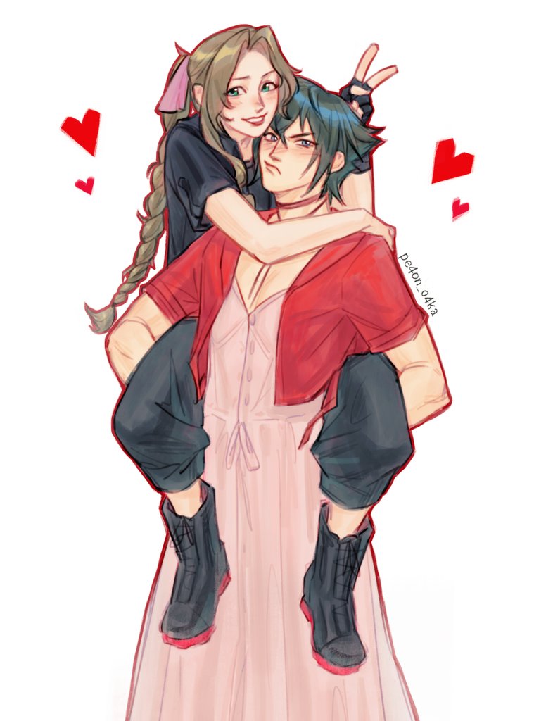 1boy 1girl aerith_gainsborough aerith_gainsborough_(cosplay) arm_around_neck artist_name black_boots black_gloves black_hair black_pantyhose black_shirt blue_eyes boots braid braided_ponytail brown_hair bunny_ears_prank carrying choker cosplay costume_switch cropped_jacket crossdressing crossover dress final_fantasy final_fantasy_vii final_fantasy_vii_rebirth final_fantasy_vii_remake final_fantasy_xv fingerless_gloves frown gloves green_eyes hair_between_eyes hair_ribbon in-franchise_crossover jacket long_dress long_hair noctis_lucis_caelum noctis_lucis_caelum_(cosplay) pantyhose parted_bangs parted_lips pe4on_o4ka piggyback pink_dress pink_ribbon red_jacket ribbon ribbon_choker shirt short_hair short_sleeves sidelocks single_braid smile white_background