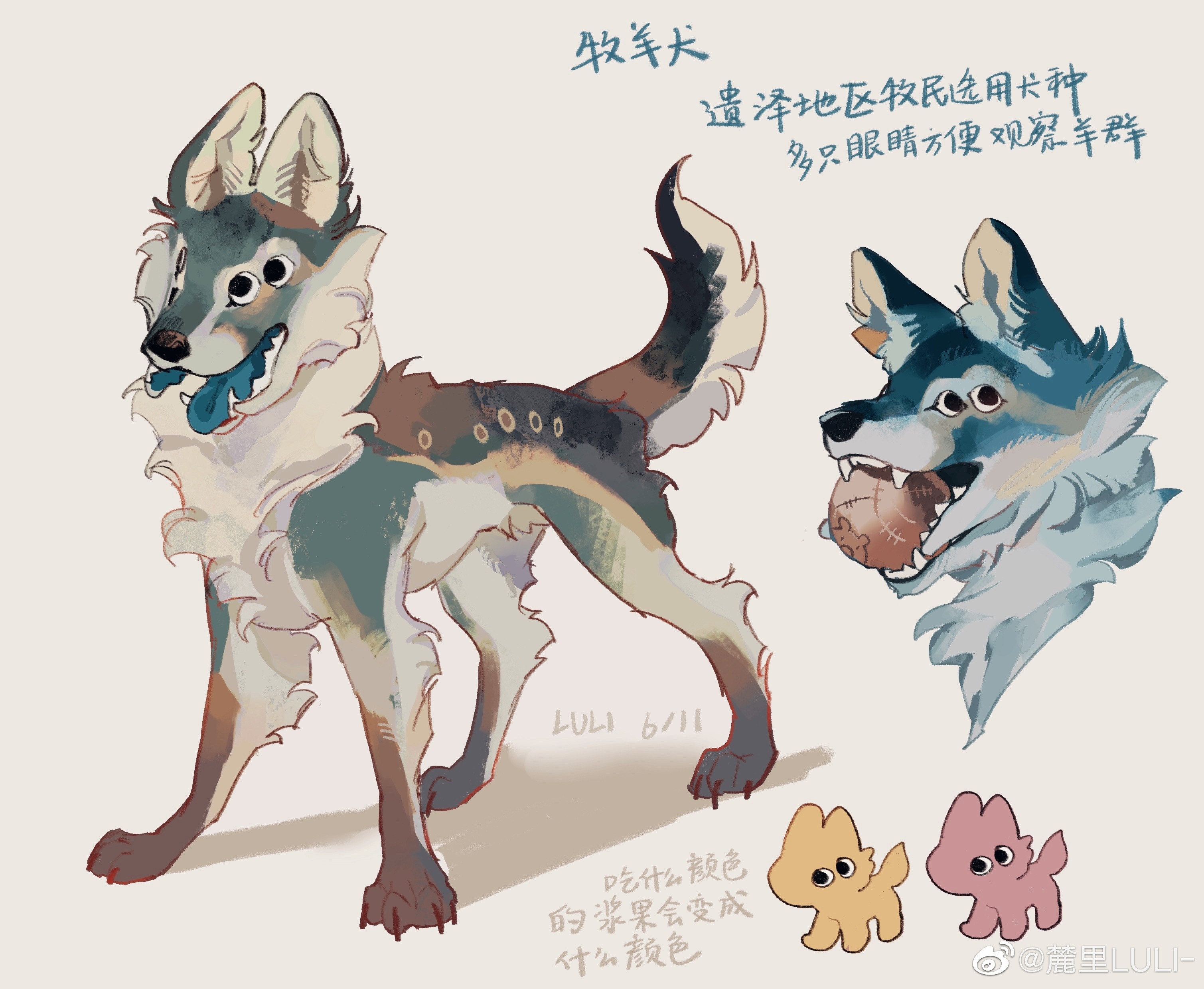 absurdres animal animal_focus aqua_fur ball black_eyes black_fur blue_fur blue_tongue brown_fur chibi chibi_inset chinese_text colored_tongue extra_eyes full_body highres holding holding_ball luli_(crocowolf333) mouth_hold multicolored_fur no_humans open_mouth original smile solo teeth watermark weibo_watermark wolf