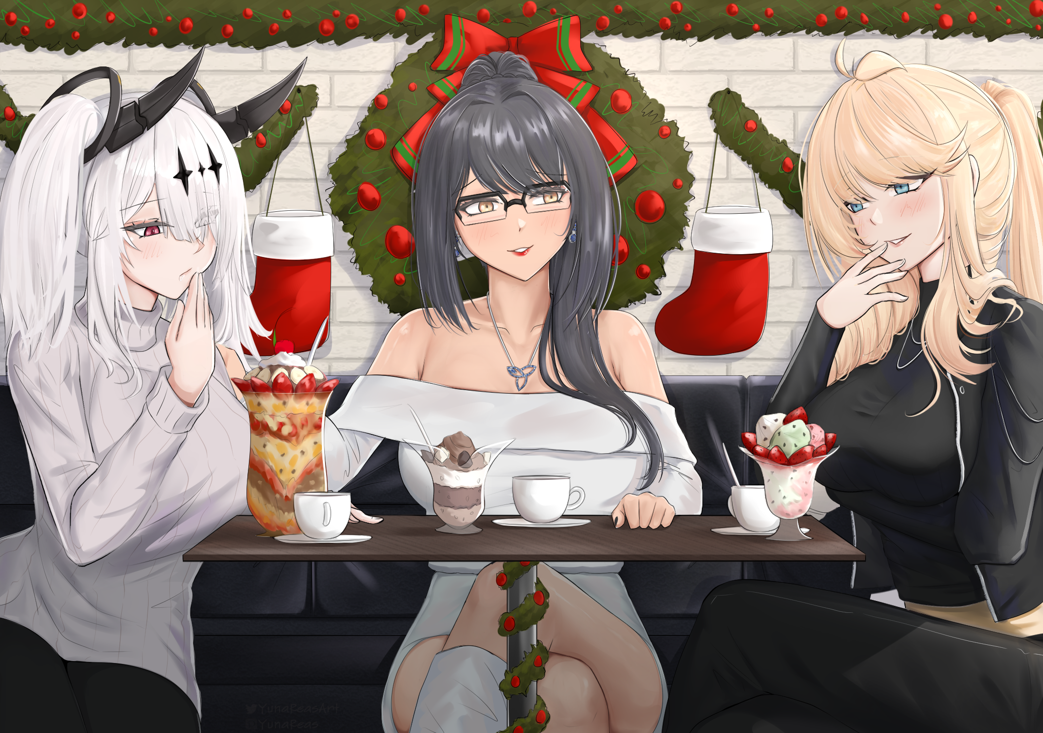 3girls azur_lane bare_shoulders black-framed_eyewear black_hair black_jacket black_pants blonde_hair blue_eyes coffee_mug commander_(azur_lane) commission crossed_legs cup female_commander_(azur_lane) food fruit high_ponytail highres howe_(azur_lane) jacket jewelry joffre_(azur_lane) lips long_sleeves mug multiple_girls necklace pants parfait parted_lips ponytail red_eyes red_lips sitting smile strawberry table white_footwear white_hair yellow_eyes yunareas