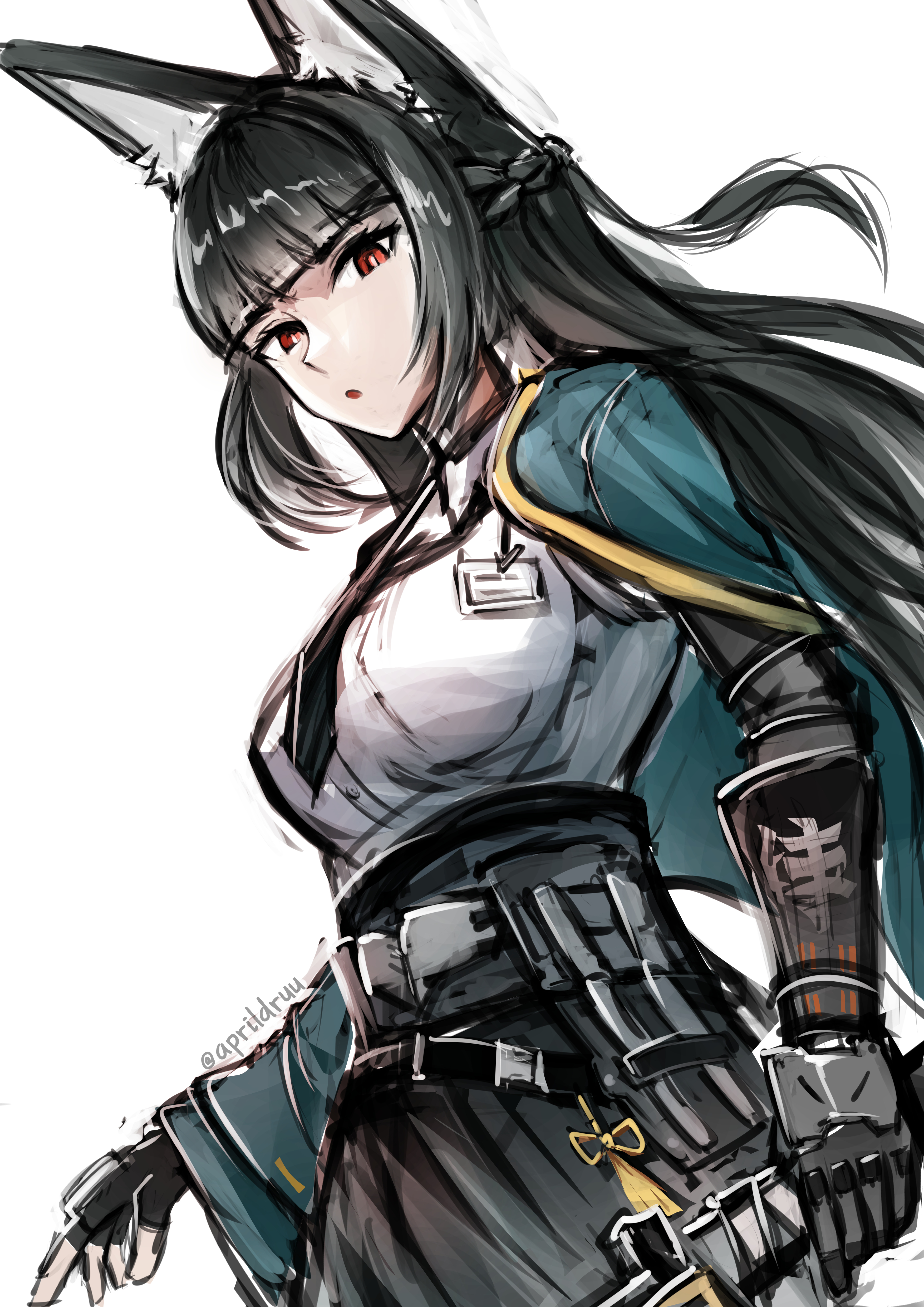 1girl absurdres andrewaprilio animal_ear_fluff animal_ears black_gloves black_hair black_necktie black_skirt blunt_bangs breasts commentary cowboy_shot dress_shirt fingerless_gloves fox_ears fox_girl gloves green_jacket high-waist_skirt highres holding holding_sword holding_weapon hoshimi_miyabi jacket long_hair looking_at_viewer necktie open_mouth shirt sidelocks simple_background single_fingerless_glove sketch skirt solo sword weapon white_background white_shirt zenless_zone_zero
