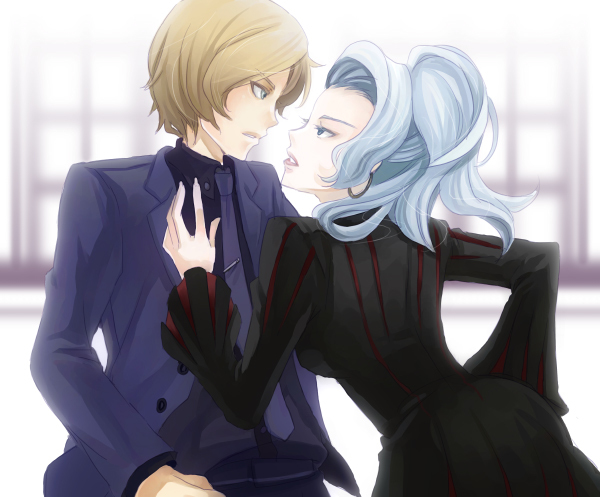 1boy 1girl black_shirt blonde_hair blue_eyes blue_jacket blue_pants blue_shirt confused facing_to_the_side formal_clothes grey_hair hand_on_another's_shoulder hand_on_own_hip hospital_rokunin_no_ishi indoors jacket looking_at_another mikan_(aquacomet) mira_kimishima navel_(hospital_rokunin_no_ishi) pants ponytail shirt teasing