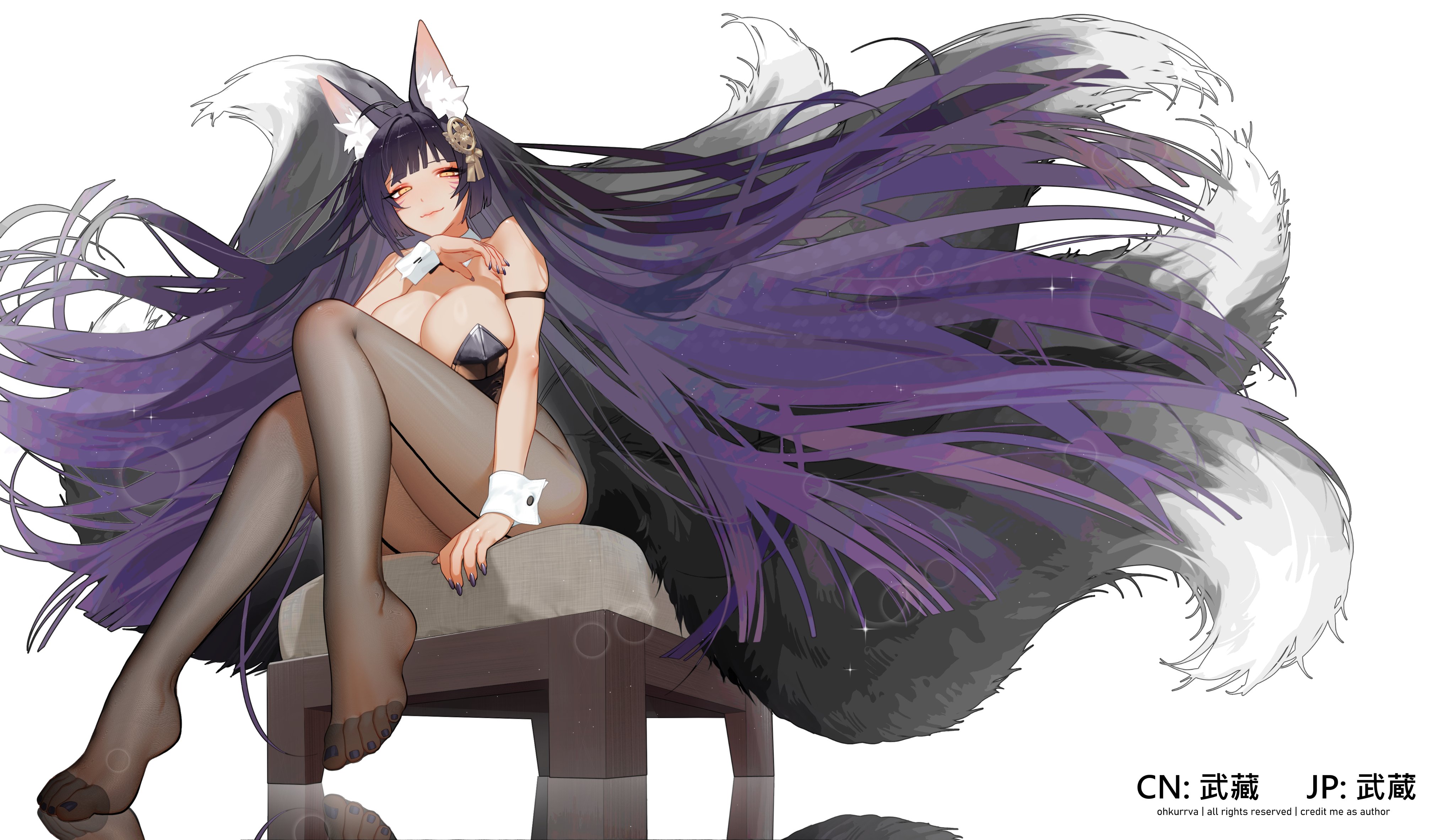 1girl absurdres animal_ears azur_lane feet fox_ears fox_girl fox_tail full_body highres kitsune legs long_hair looking_at_viewer mature_female multiple_tails musashi_(azur_lane) musashi_(battleship) nail_polish no_shoes ohkurrva pantyhose playboy_bunny solo tail thighs very_long_hair