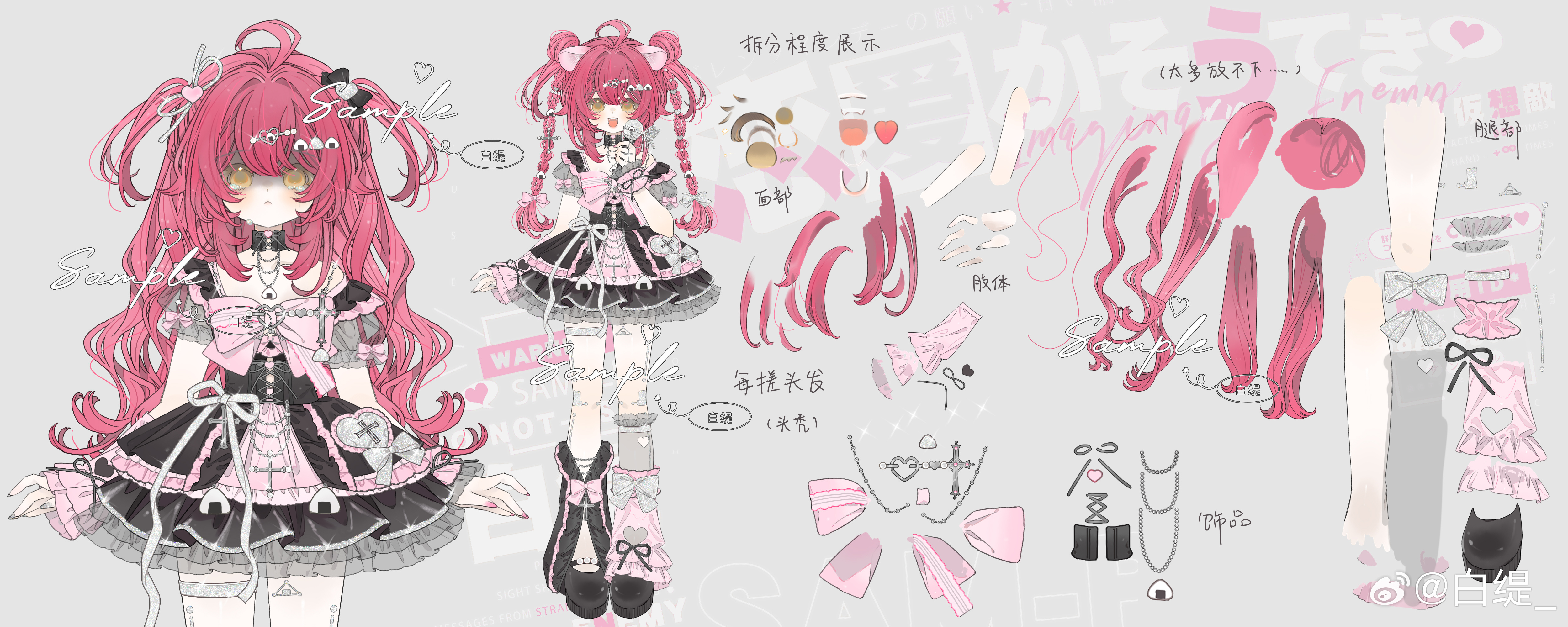 1girl absurdres asymmetrical_legwear bare_shoulders bity3155660241 black_collar black_dress black_footwear bow bowtie braid reference_sheet chinese_commentary closed_mouth collar commentary_request commission cowboy_shot dot_nose double_bun dress dress_ribbon frilled_dress frilled_sleeves frilled_socks frills frown full_body grey_background grey_socks hair_bun happy heart highres holding holding_microphone kneehighs lace-trimmed_wrist_cuffs lace_trim light_blush long_hair looking_at_viewer microphone mismatched_legwear multiple_views open_mouth original pink_bow pink_bowtie pink_hair pink_wrist_cuffs ribbon sample_watermark shaded_face shoes short_dress short_sleeves simple_background single_kneehigh single_sock smile socks standing thigh_strap twin_braids two_side_up very_long_hair watermark white_ribbon wrist_cuffs yellow_eyes