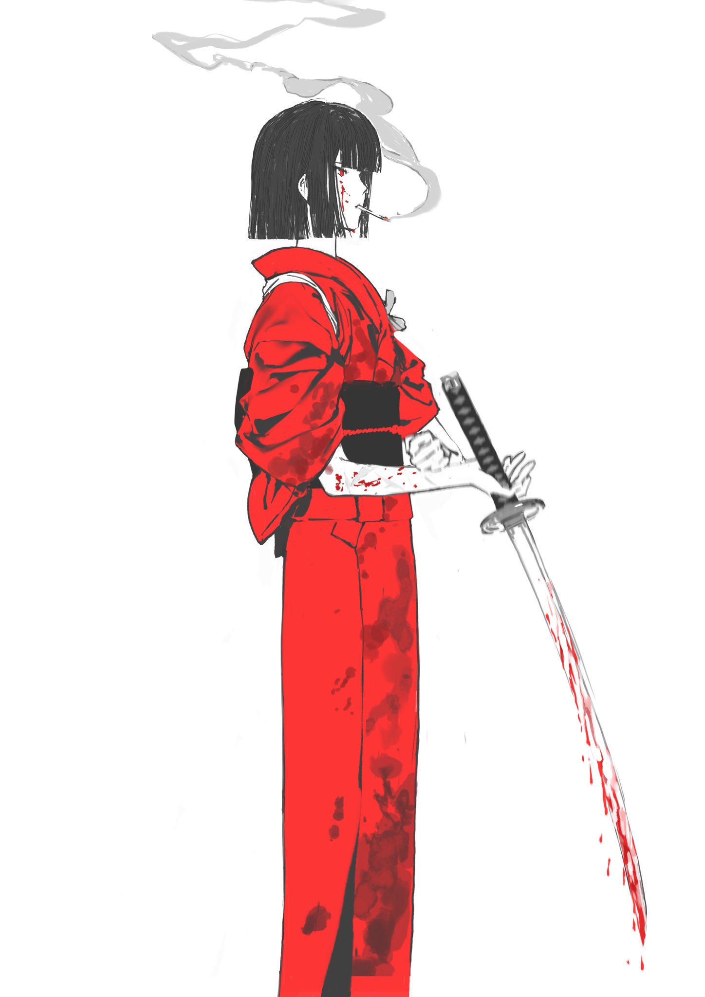 1girl black_hair black_sash blood blood_on_arm blood_on_clothes blood_on_face bloody_weapon blunt_bangs bob_cut cigarette feet_out_of_frame highres holding holding_sword holding_weapon japanese_clothes kimono limbus_company long_sleeves looking_ahead muisumk ootachi project_moon red_eyes red_kimono ryoshu_(project_moon) sash simple_background smoke smoking solo standing sword tasuki weapon white_background wide_sleeves