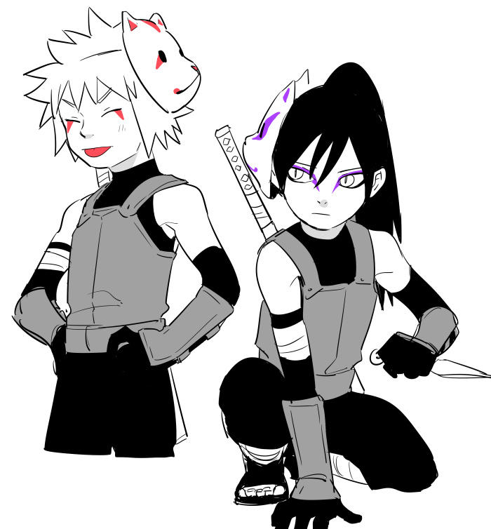 ^_^ aged_down alternate_costume alternate_hairstyle armor bandaged_arm bandaged_leg bandages closed_eyes eyeliner facial_mark fox_mask gauntlets hair_tied_up hand_on_ground hands_on_own_hips holding holding_behind_back holding_sword holding_sword_behind_back holding_weapon holding_weapon_behind_back jiraiya_(naruto) kutuyatti makeup mask mask_on_head monochrome naruto_(series) orochimaru_(naruto) ponytail spiked_hair sword tongue tongue_out weapon
