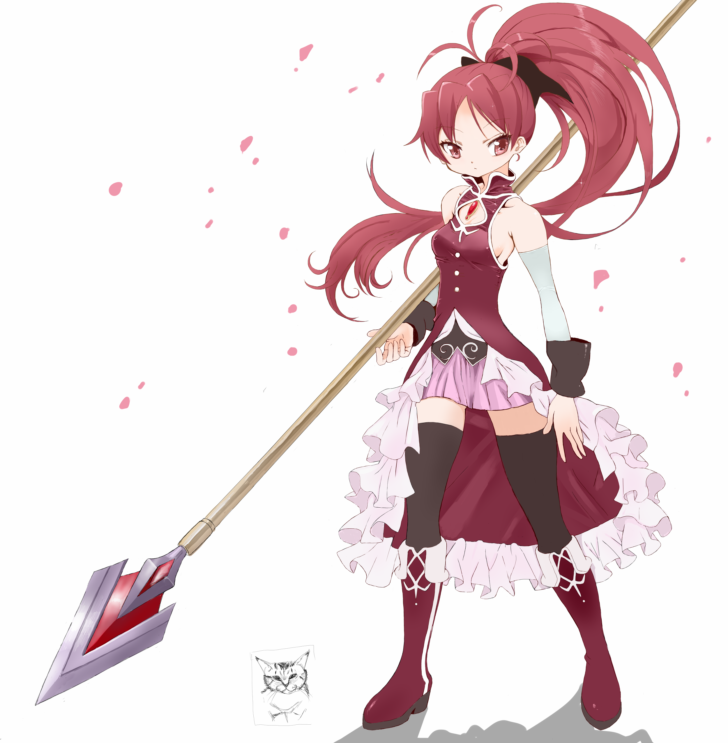 1girl absurdres bare_shoulders boots breasts commentary_request detached_sleeves expressionless full_body highres holding holding_polearm holding_weapon long_hair looking_at_viewer mahou_shoujo_madoka_magica mahou_shoujo_madoka_magica_(anime) polearm ponytail red_eyes red_hair sakura_kyoko sakura_kyoko_(magical_girl) skirt small_breasts solo thighhighs toshi_(little-fluffy-cloud) weapon zettai_ryouiki