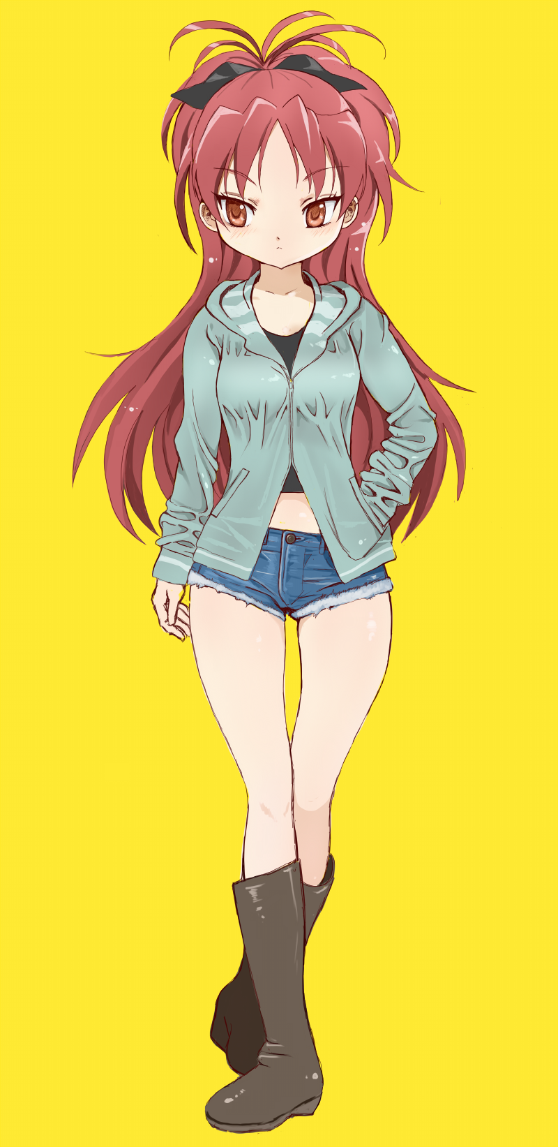 1girl boots commentary_request denim denim_shorts expressionless full_body highres hood hoodie long_hair looking_to_the_side mahou_shoujo_madoka_magica mahou_shoujo_madoka_magica_(anime) ponytail red_eyes red_hair sakura_kyoko short_shorts shorts solo thigh_gap toshi_(little-fluffy-cloud) yellow_background