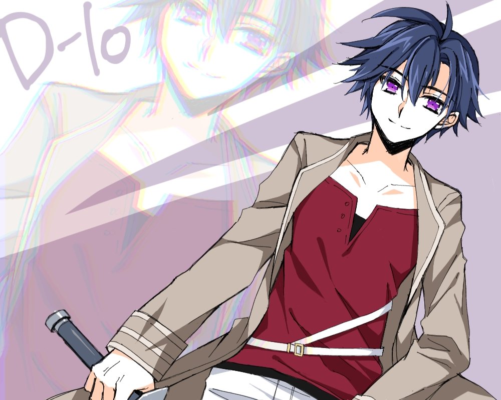 1boy asti2 blue_hair closed_mouth coat collarbone commentary_request eiyuu_densetsu grey_coat holding holding_sword holding_weapon kai_no_kiseki kuro_no_kiseki_(series) male_focus open_clothes open_coat pants purple_eyes rean_schwarzer red_shirt shirt short_hair smile solo standing sword weapon white_pants zoom_layer