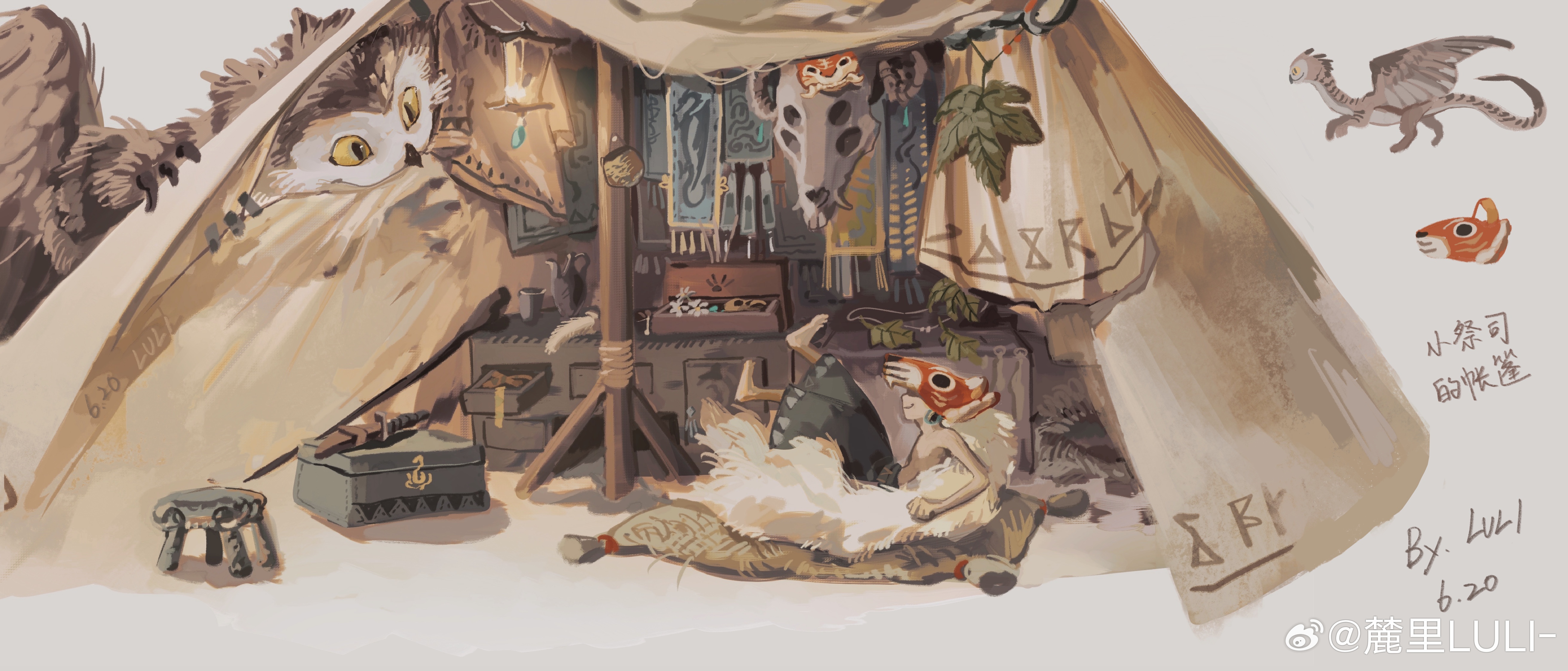 absurdres animal animal_hat animal_skull bench brown_feathers brown_wings chinese_text colored_sclera feathers green_skirt grey_background hat highres lamp looking_at_another luli_(crocowolf333) lying on_back original plant skirt smile stool tent topless_male watermark weibo_watermark wings yellow_sclera