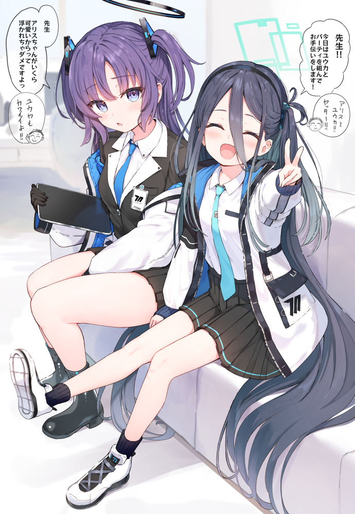 2girls :d ^_^ aris_(blue_archive) between_legs black_footwear black_gloves black_hair black_jacket black_skirt black_socks blue_archive blue_eyes blue_necktie blurry blurry_background boots chair closed_eyes commentary couch depth_of_field doodle_sensei_(blue_archive) facing_viewer gloves halo hand_between_legs holding jacket long_hair long_sleeves looking_at_viewer monitor multiple_girls necktie office_chair on_couch one_side_up open_clothes open_jacket open_mouth outstretched_arm parted_lips pleated_skirt puffy_long_sleeves puffy_sleeves purple_hair revision ribbed_socks sensei_(blue_archive) shirt sitting skirt sleeves_past_wrists smile socks sune_(mugendai) swivel_chair tablet_pc translation_request two_side_up very_long_hair white_footwear white_jacket white_shirt yuuka_(blue_archive)