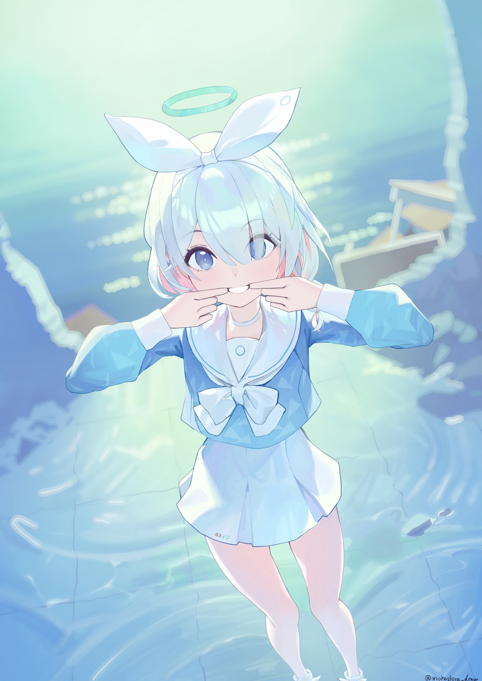 1girl absurdres arona_(blue_archive) backlighting blue_archive blue_eyes blue_hair blue_halo blue_shirt blue_theme blurry blurry_background bow bow_hairband choker colored_inner_hair eyes_visible_through_hair grin hair_over_one_eye hairband halo highres legs light_blue_hair long_sleeves looking_at_viewer mouth_pull multicolored_hair onbashria pink_hair sailor_collar shirt skirt smile solo standing twitter_username water white_bow white_choker white_sailor_collar white_skirt