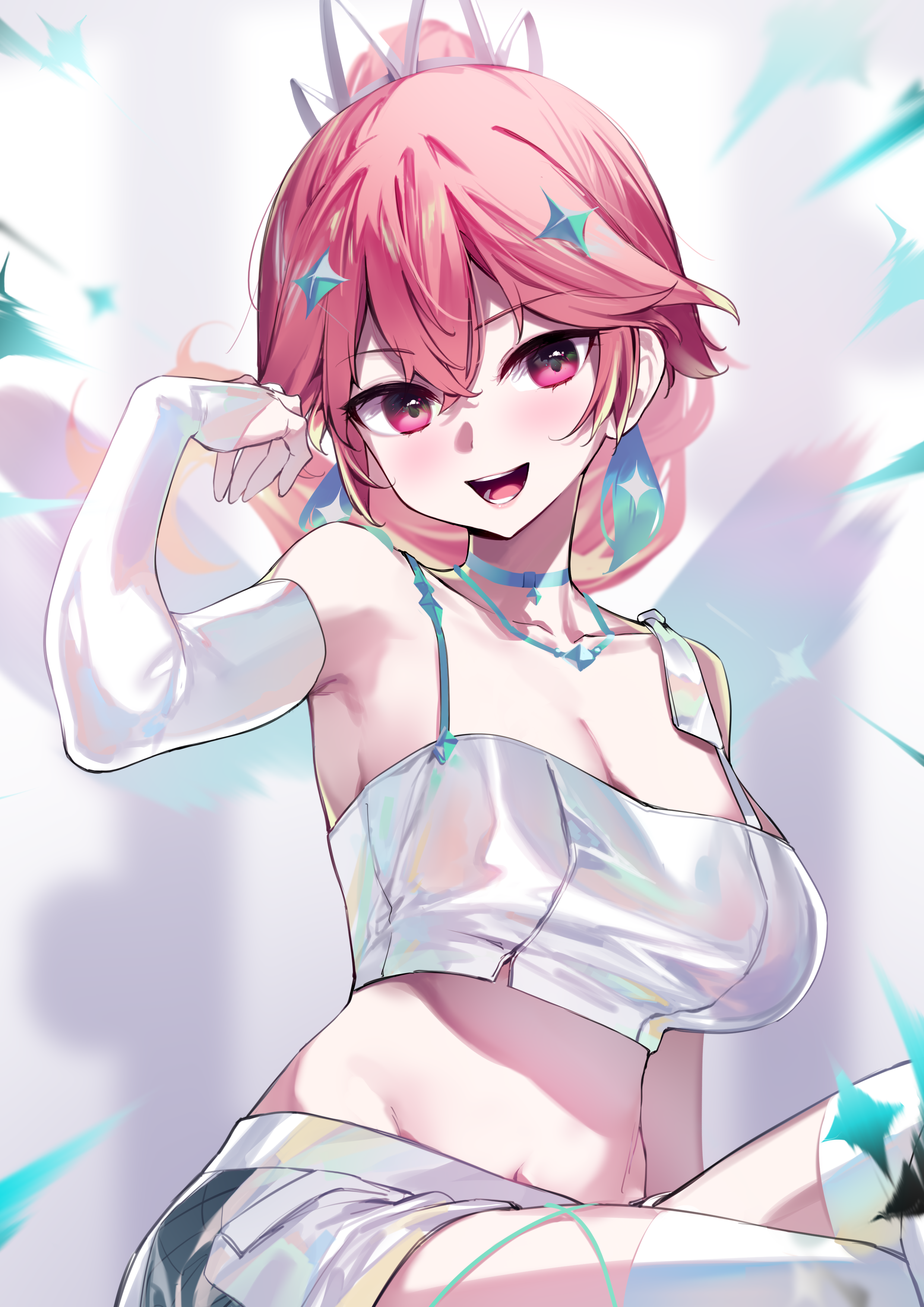 1girl absurdres bare_shoulders breasts bridal_gauntlets choker detached_sleeves earrings feather_earrings feathers hair_ornament high_ponytail highres hololive hololive_english jewelry large_breasts long_hair looking_at_viewer midriff mirage_(takanashi_kiara) necklace official_alternate_costume open_mouth orange_hair ponytail purple_eyes single_bridal_gauntlet single_detached_sleeve single_sleeve smile solo sparkle strapless takanashi_kiara tube_top virtual_youtuber white_tube_top yaguo