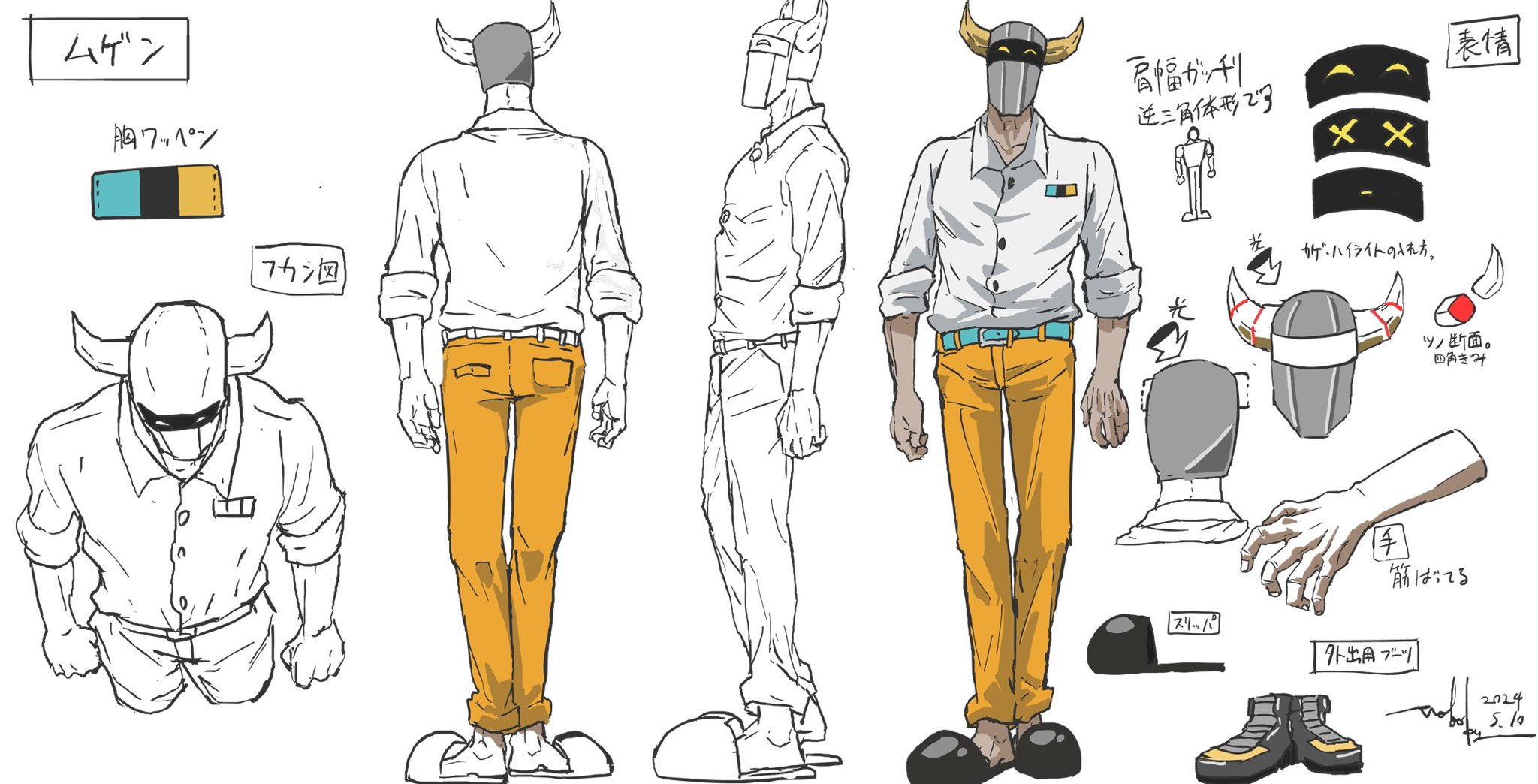 2024 anime_coloring aqua_belt arms_at_sides arrow_(symbol) belt black_footwear black_outline brown_horns buttons character_name character_request collar color_guide commentary concept_art dated dress_shirt facing_away facing_to_the_side facing_viewer fake_horns from_above from_behind from_side grey_mask helmet highres horned_helmet horns kuzuri_(zutomayo) mask multiple_views official_art outline pants partially_colored production_art second-party_source shirt signature sleeves_rolled_up slippers three-quarter_sleeves translation_request turnaround unworn_footwear white_collar white_sleeves wing_collar yellow_eyes yellow_pants zutto_mayonaka_de_ii_no_ni