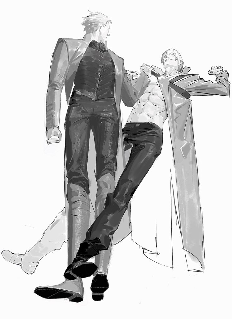 2boys abs black_footwear black_pants boots brothers clenched_hand collar_tug dante_(devil_may_cry) devil_may_cry_(series) full_body greyscale hair_between_eyes hair_slicked_back long_coat long_sleeves male_focus ming07312438 monochrome multiple_boys muscular muscular_male pants parted_lips short_hair siblings smile vergil_(devil_may_cry) white_background