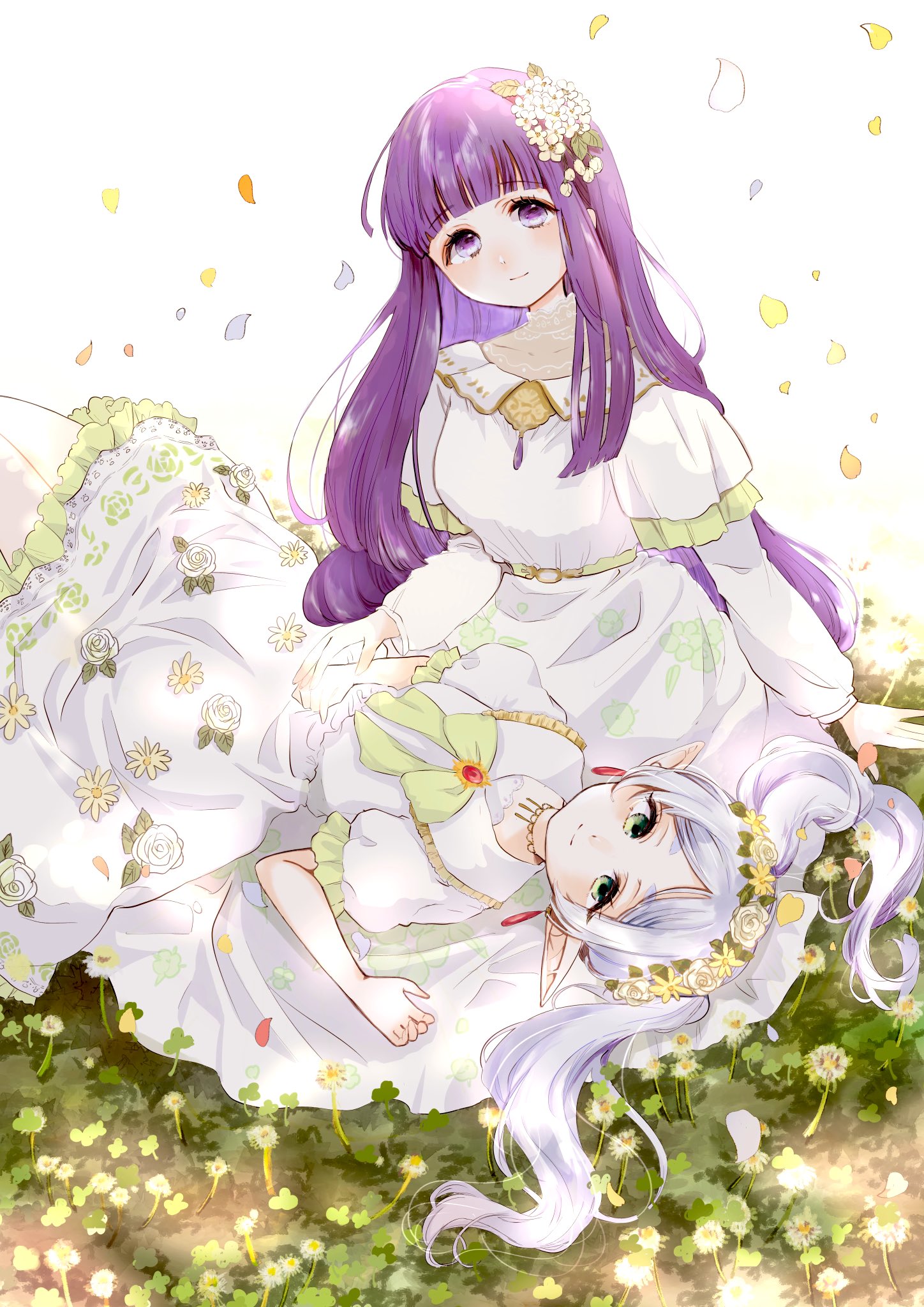 2girls blunt_bangs blunt_ends bow breasts choker dress dress_bow earrings falling_petals fern_(sousou_no_frieren) field flower flower_field frieren green_eyes grey_hair hair_flower hair_ornament highres hime_cut jewelry kotori_hana lap_pillow light_blush long_dress long_sleeves looking_at_viewer medium_breasts multiple_girls parted_bangs petals pointy_ears puffy_short_sleeves puffy_sleeves purple_eyes purple_hair short_sleeves sidelocks smile sousou_no_frieren twintails white_dress