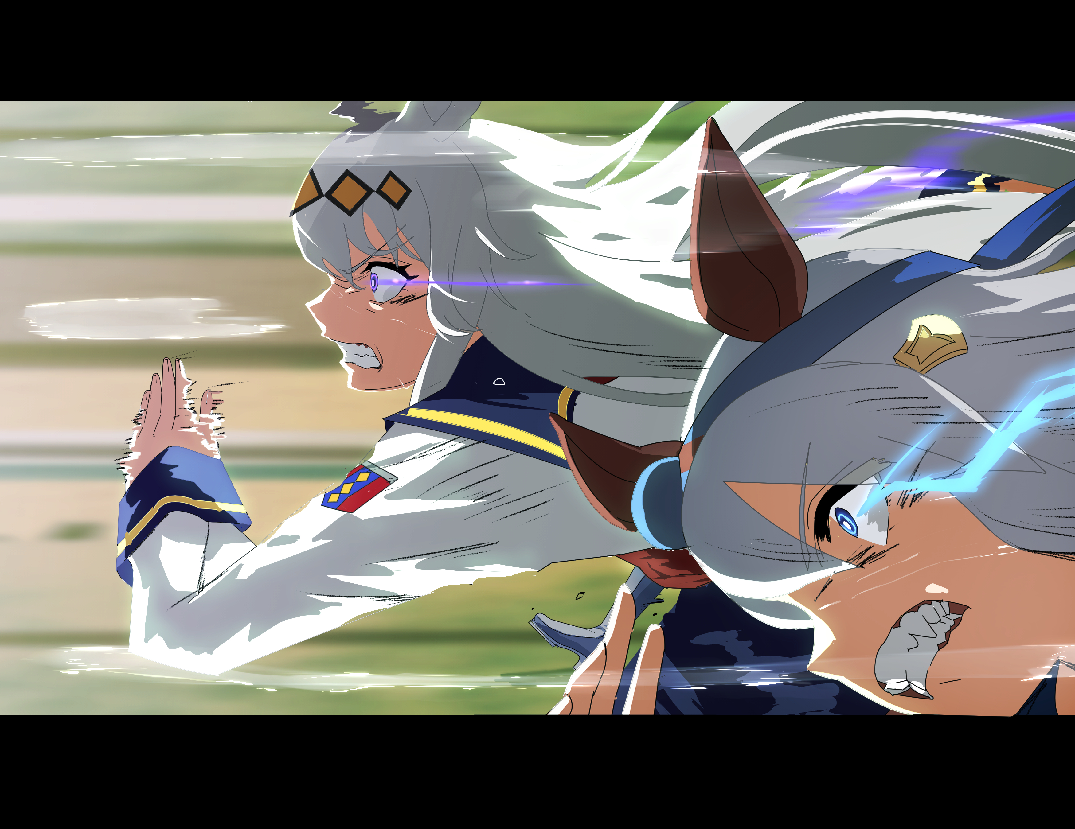 2girls absurdres blue_eyes blue_hairband blue_sailor_collar blue_skirt commentary ear_covers frown glowing glowing_eyes grey_hair grimace hair_ornament hairband highres horse_girl letterboxed light_trail long_hair long_sleeves motion_blur multiple_girls no_uwazumi official_style oguri_cap_(starlight_beat)_(umamusume) oguri_cap_(umamusume) parody running sailor_collar shirt skirt style_parody tamamo_cross_(umamusume) umamusume umamusume:_cinderella_gray white_shirt