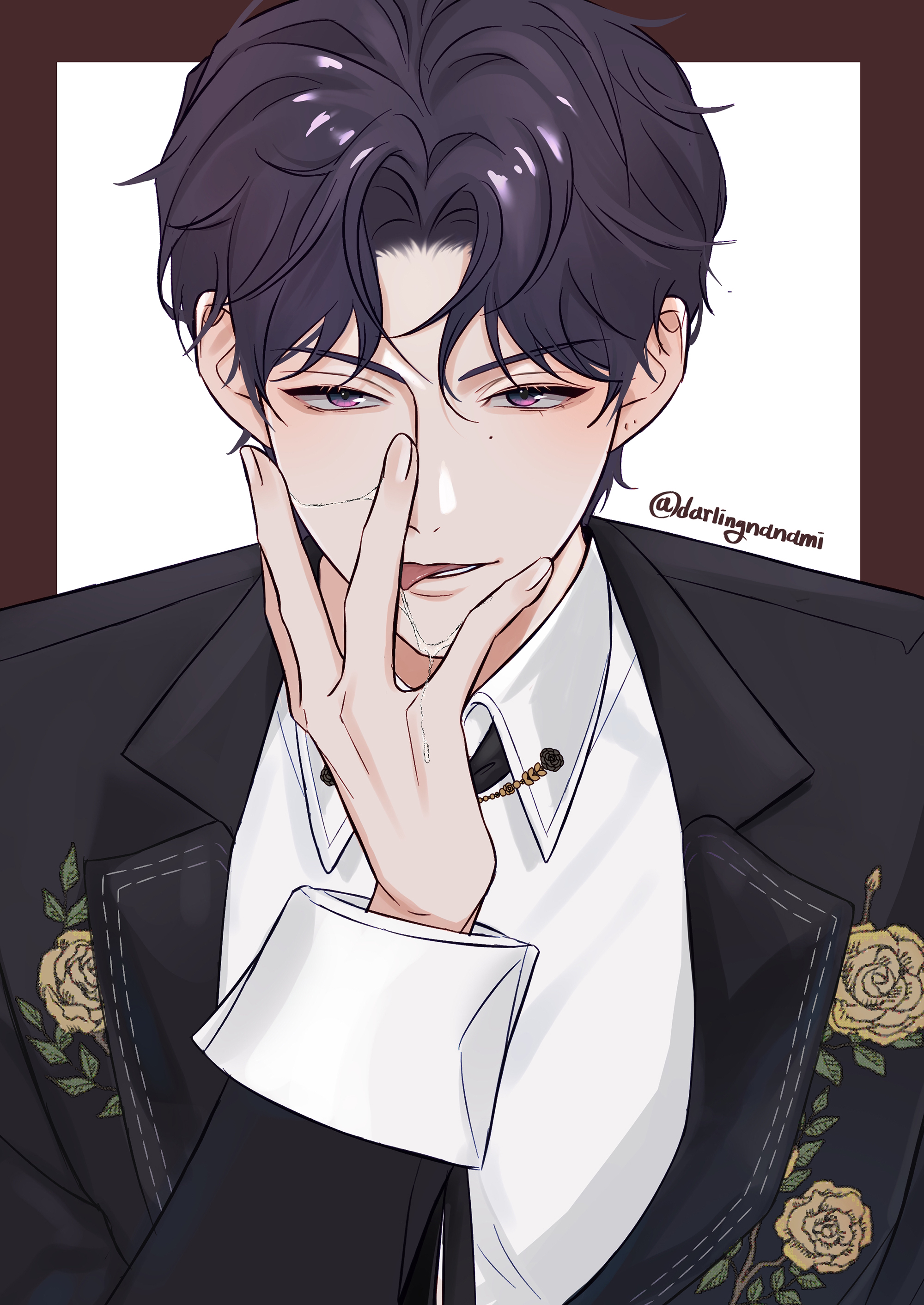 1boy absurdres artist_name black_coat border brown_border choppy_bangs coat collared_coat collared_shirt commentary_request curtained_hair darlingnanami eyelashes floral_print gradient_eyes highres long_sleeves looking_at_viewer love_and_deepspace lower_teeth_only male_focus mole mole_under_eye multicolored_eyes outside_border parted_bangs parted_lips purple_hair rafayel_(love_and_deepspace) saliva saliva_trail shirt short_hair solo teeth tongue tuxedo twitter_username white_background white_shirt