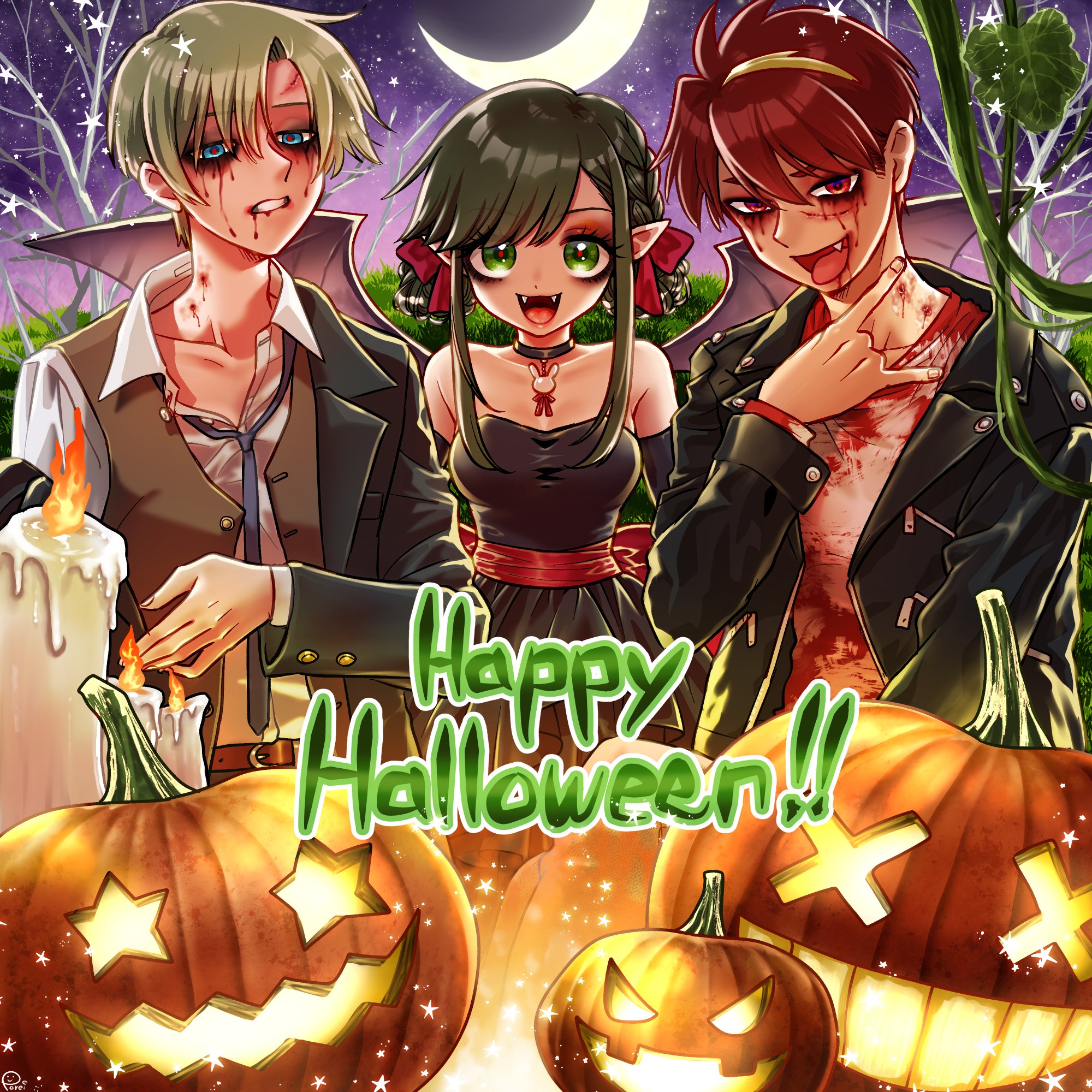 1girl 2boys amatsuka_yui asadoke_no_majo bare_shoulders blue_eyes braid braided_bun brown_hair candle charlotte_(asadoke_no_majo) dress green_eyes hair_bun halloween halloween_costume happy_halloween highres jack-o'-lantern long_hair moon multicolored_hair multiple_boys nogi_shuichi official_art poreisan_(portrain) pumpkin red_eyes red_hair sharp_teeth short_hair streaked_hair teeth vampire_costume