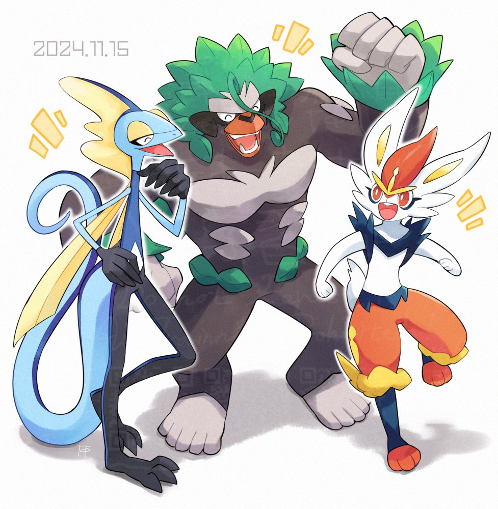 3others bright_pupils cinderace closed_eyes furry geev gen_8_pokemon happy inteleon multiple_others nintendo open_mouth orange_eyes other_focus pokemon pokemon_(creature) rillaboom shadow smile standing standing_on_one_leg starter_pokemon_trio tail white_background white_pupils