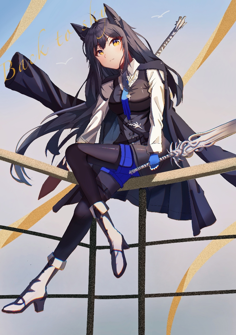 1girl ahoge animal_ears arknights black_coat black_hair black_pantyhose black_vest blue_gloves blue_necktie blue_shorts chinese_commentary chromatic_aberration closed_mouth coat coat_on_shoulders collared_shirt commentary expressionless full_body gloves holding holding_sword holding_weapon jaggy_lines long_hair long_sleeves mulong necktie official_alternate_costume pantyhose shirt short_shorts shorts simple_bird sitting solo sword texas_(arknights) texas_the_omertosa_(arknights) vest weapon weapon_on_back white_shirt wind wolf_ears wolf_girl yellow_eyes