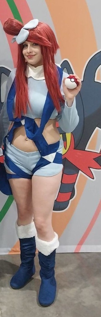 1girl boots breasts cosplay crop_top gen_7_pokemon goosaphone large_breasts litten long_hair long_sleeves looking_at_viewer nintendo poke_ball pokemon pokemon_black_and_white real_life shorts skyla_(pokemon) skyla_(pokemon)_(cosplay)