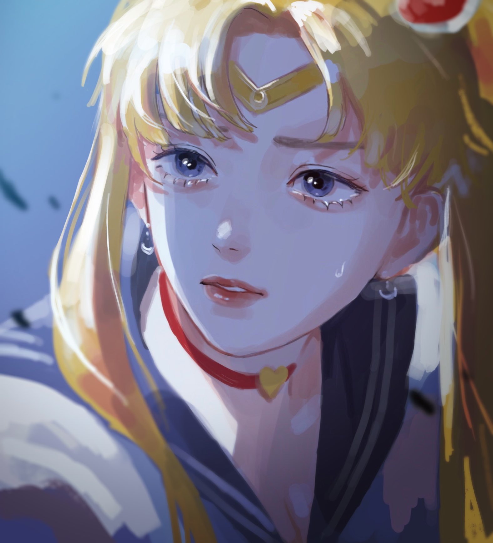 1girl bishoujo_senshi_sailor_moon blonde_hair blue_eyes blue_sailor_collar choker circlet close-up commentary_request crescent crescent_earrings earrings heart heart_choker highres jewelry korean_commentary looking_to_the_side magical_girl meme parted_lips pinky_purple sailor_collar sailor_moon sailor_moon_redraw_challenge_(meme) solo sweatdrop tsukino_usagi twintails upper_body