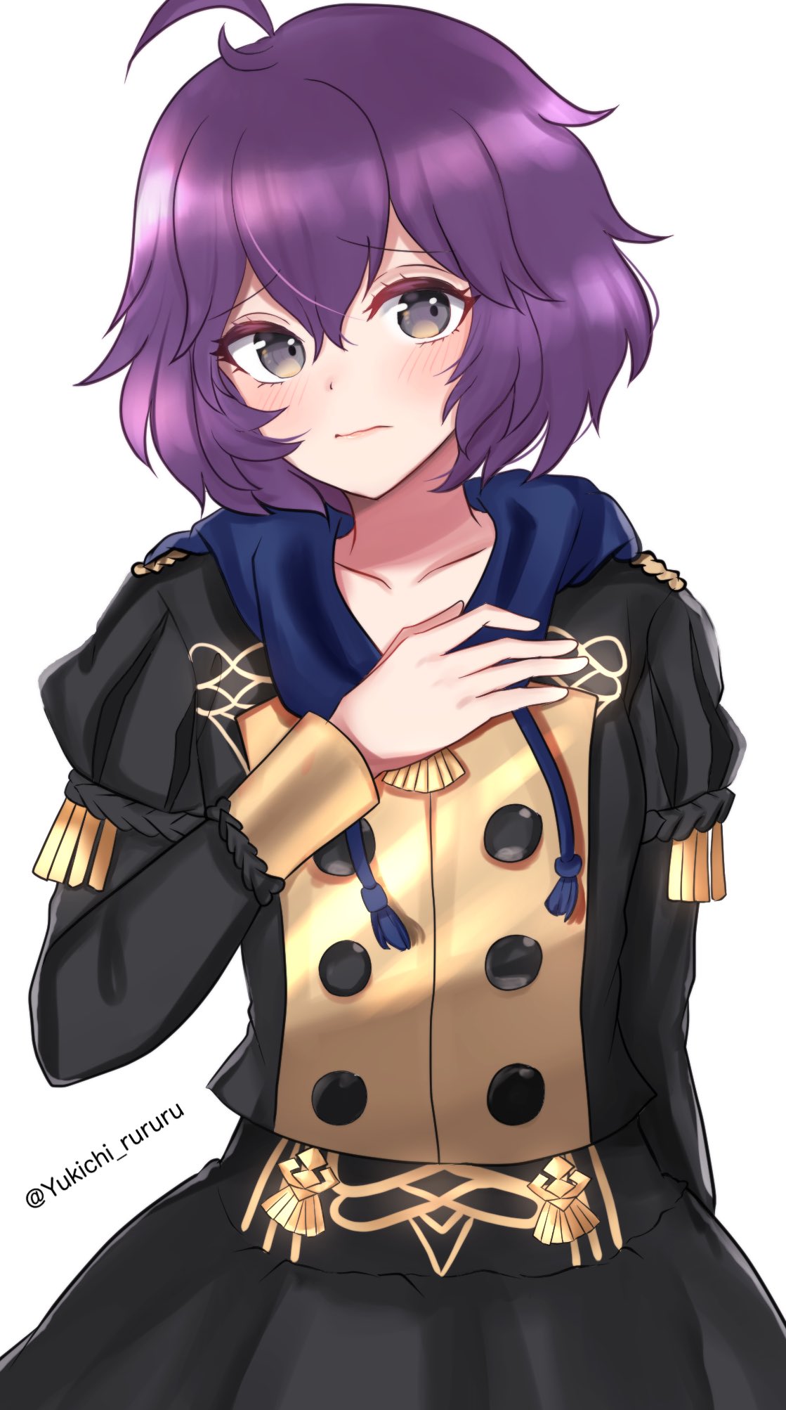 1girl ahoge bernadetta_von_varley black_jacket black_skirt fire_emblem fire_emblem:_three_houses garreg_mach_monastery_uniform grey_eyes hand_on_own_chest highres jacket juliet_sleeves long_sleeves looking_at_viewer nintendo puffy_sleeves purple_hair short_hair simple_background skirt skirt_set solo white_background yukichi_(yukichi_rururu)