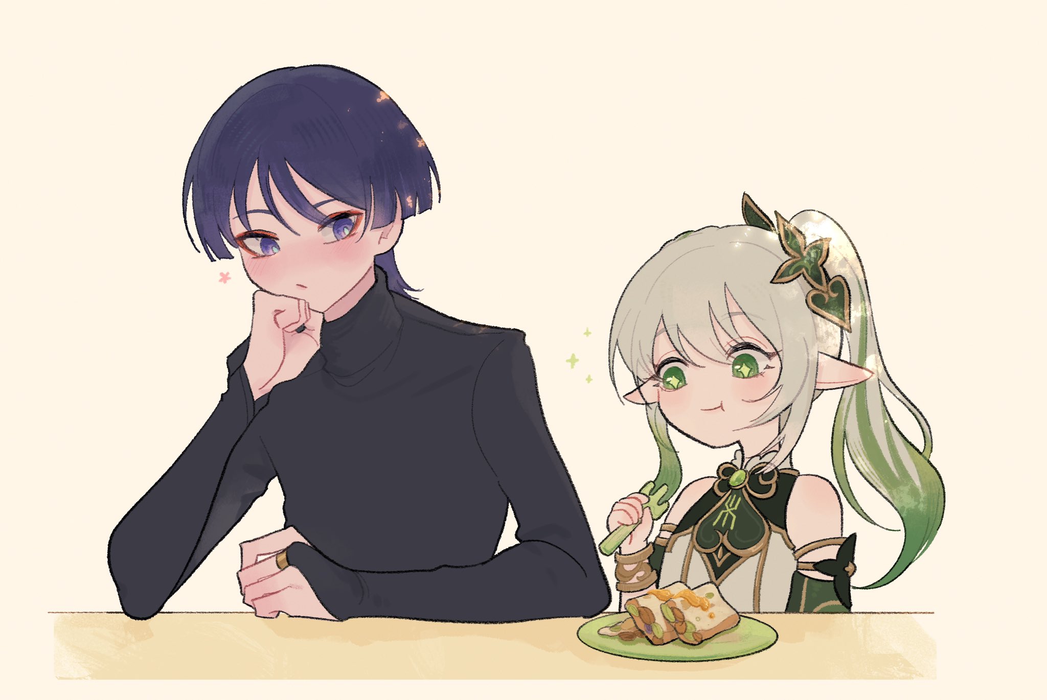 1boy 1girl arm_rest armlet bare_shoulders black_shirt black_sleeves blunt_ends blush bracelet candied_ajilenakh_nut_(genshin_impact) cheek_bulge clenched_hand cross-shaped_pupils detached_sleeves dress eyeliner eyeshadow fork genshin_impact gold gold_ring gold_trim green_eyes green_hair green_sleeves head_rest highres holding holding_fork jewelry long_hair long_sleeves looking_at_another looking_down makeup middle_ring multicolored_hair nahida_(genshin_impact) plate pointy_ears purple_eyes purple_hair red_eyeliner red_eyeshadow sanpaku scaramouche_(genshin_impact) shirt side-by-side side_ponytail sidelocks stephynne streaked_hair symbol-shaped_pupils turtleneck turtleneck_shirt white_background white_dress white_hair