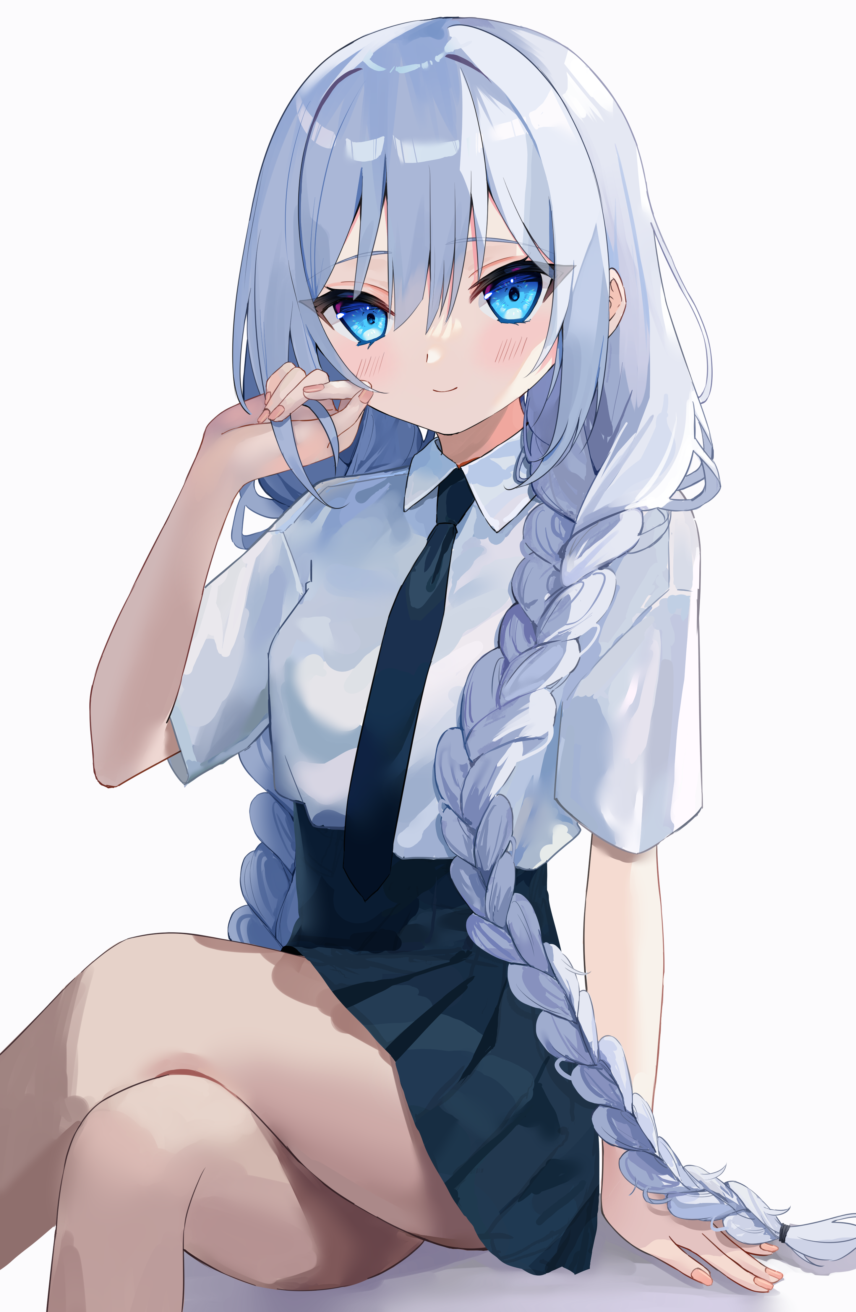 1girl absurdres black_necktie black_skirt blue_eyes blush braid closed_mouth collared_shirt crossed_legs grey_hair hair_between_eyes highres long_hair looking_at_viewer necktie original playing_with_own_hair pleated_skirt shirt short_sleeves simple_background sinobi_illust sitting skirt smile solo twin_braids white_background white_shirt