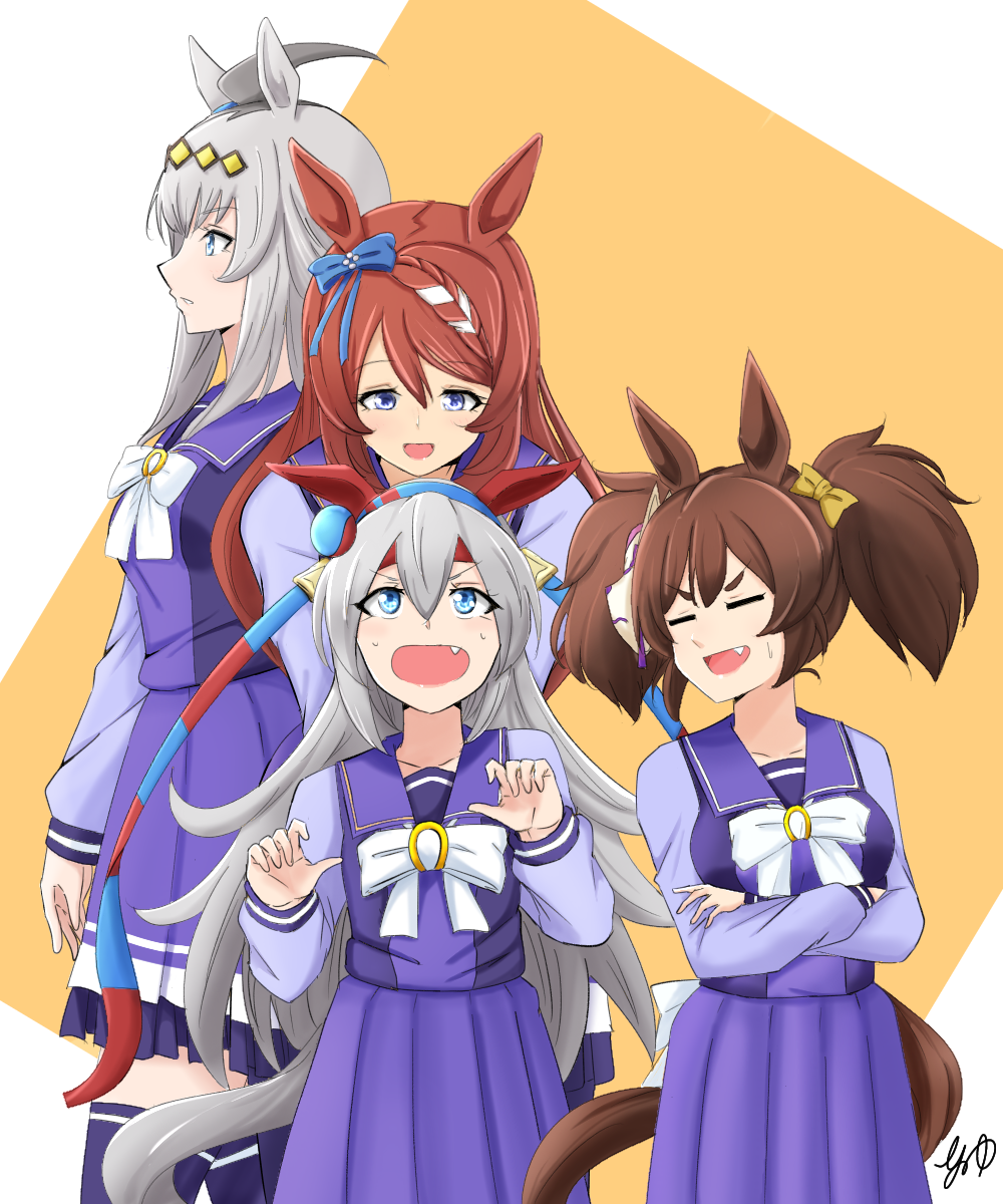 4girls ahoge animal_ears artist_name blue_eyes blue_hairband blue_thighhighs bow bowtie braid brown_hair crossed_arms ear_bow ear_ornament everfree_lovelive fang fox_mask frilled_skirt frills frown grey_hair hair_ornament hairband headband highres horse_ears horse_girl horse_tail inari_one_(umamusume) leaning_forward long_hair long_sleeves looking_at_another looking_to_the_side mask mask_on_head miniskirt multicolored_hair multiple_girls oguri_cap_(umamusume) open_mouth pleated_skirt purple_sailor_collar purple_shirt purple_skirt red_headband sailor_collar school_uniform serafuku shirt short_hair signature skirt smile super_creek_(umamusume) sweatdrop tail tamamo_cross_(umamusume) thighhighs tracen_school_uniform twintails two-tone_hair umamusume white_bow white_bowtie white_hair winter_uniform