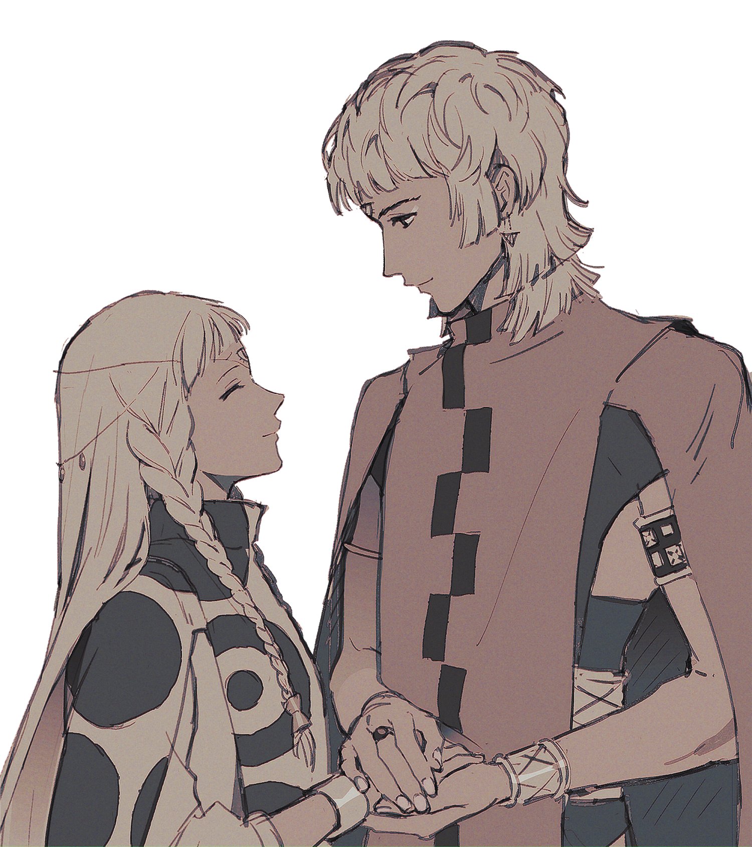 1boy 1girl blunt_bangs bracelet braid brother_and_sister cloak closed_eyes closed_mouth commentary edeni english_commentary eupha_(metaphor:_refantazio) eye_contact highres holding_hands jewelry long_hair looking_at_another metaphor:_refantazio patterned_clothing profile siblings side_braid simple_background single_braid smile sophie_(693432) third_eye upper_body very_long_hair white_background