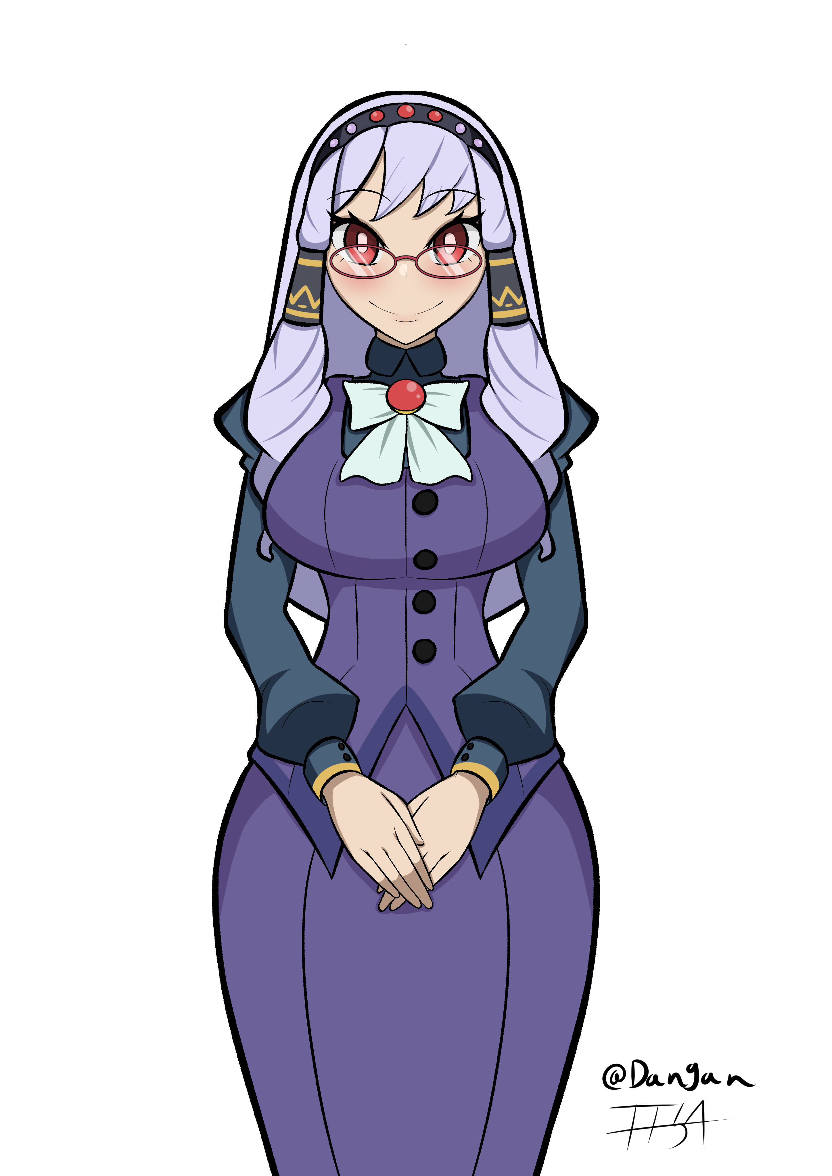 1girl 2024 absurdres artist_name black_eyes black_pantyhose blush bow breasts bright_pupils chest_jewel collarbone commentary dangan7734 dress english_commentary feet_out_of_frame female_focus full_body glasses gradient_clothes gradient_dress grey_hair hairband hairdressing highres juliet_sleeves kagoshima_botan large_breasts long_sleeves low-tied_sidelocks own_hands_together pantyhose ponytail puffy_short_sleeves puffy_sleeves purple_dress red-tinted_eyewear red_eyes reference_sheet short_sleeves sideboob sidelocks simple_background smile solo standing straight-on sushi_ben swept_bangs tareme tinted_eyewear undershirt vest white_background white_bow white_pupils