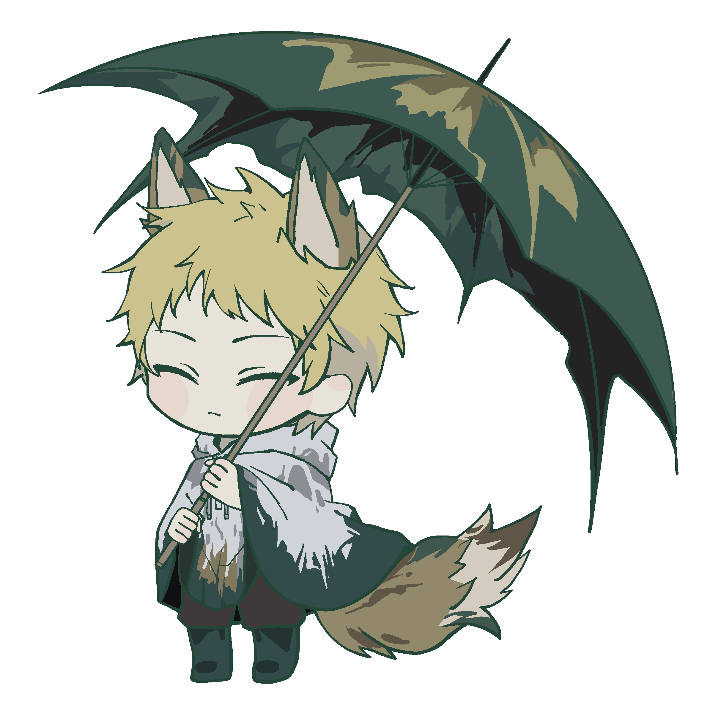 1boy alternate_costume animal_ears atou_haruki black_boots blonde_hair blush_stickers boots brown_pants chibi chibi_only chinese_commentary closed_eyes closed_mouth coat commentary_request dirty dirty_clothes e.g.o_(project_moon) fox_boy fox_ears fox_tail highres holding holding_umbrella kemonomimi_mode limbus_company long_sleeves male_focus pants project_moon saibou_shinkyoku short_hair simple_background solo sunshower_(e.g.o) tail umbrella white_background white_coat wide_sleeves yongzhehentai