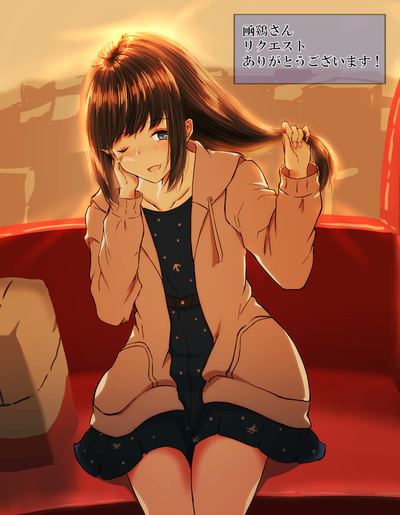 1girl :d anchor_print anchor_symbol belt berukuto_(berukuto_47) black_belt blue_dress blush brown_hair collarbone commentary_request cowboy_shot drawstring dress fubuki_(kancolle) fubuki_(spring)_(kancolle) grey_eyes grey_jacket hair_tie hand_on_own_cheek hand_on_own_face hand_up happy_birthday hood hood_down hooded_jacket jacket kantai_collection long_hair long_sleeves looking_at_viewer medium_dress one_eye_closed open_clothes open_jacket open_mouth polka_dot polka_dot_dress sidelocks sitting smile solo translation_request untying_hair