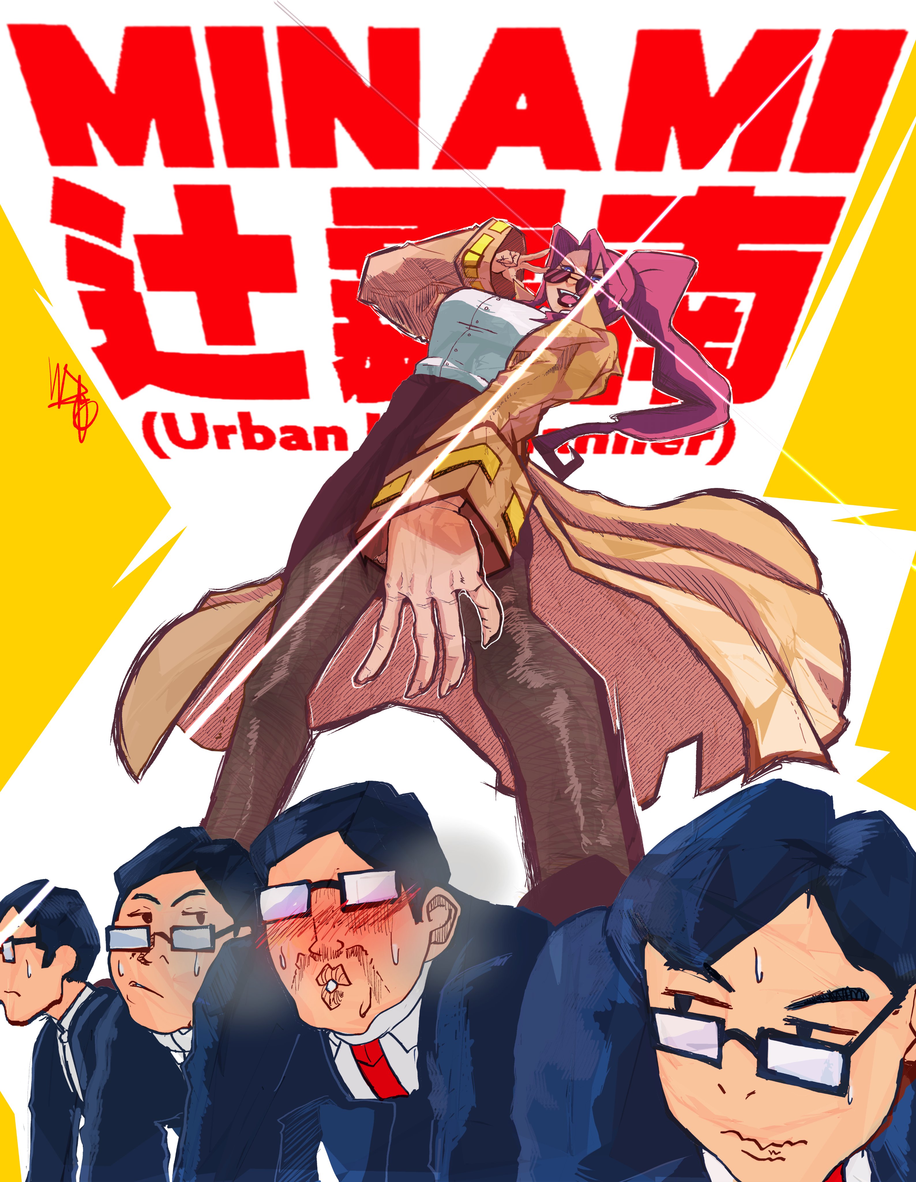 1girl 2023 4boys absurdres adjusting_eyewear all_fours annoyed assertive_female black_hair black_lips black_pantyhose blue_eyes blue_suit blush breasts brown_jacket brown_pantyhose business_suit character_name coat collar commentary curtained_hair english_commentary flipmurphy180 foreshortening formal_clothes from_below high_heels highres jacket japanese_text jitome large_breasts long_hair long_sleeves looking_at_viewer multiple_boys necktie off_shoulder open_mouth pantyhose parted_bangs parted_lips pencil_skirt ponytail purple_hair red-tinted_eyewear red_necktie reference_sheet salaryman short_hair skirt sleeves_past_wrists smile solo spread_fingers standing_on_person struggling suit sunglasses sushi_ben sweatdrop teeth tinted_eyewear trench_coat tsujigiri_minami underbust upper_teeth_only v-shaped_eyebrows very_long_hair wavy_mouth white_collar yellow_background