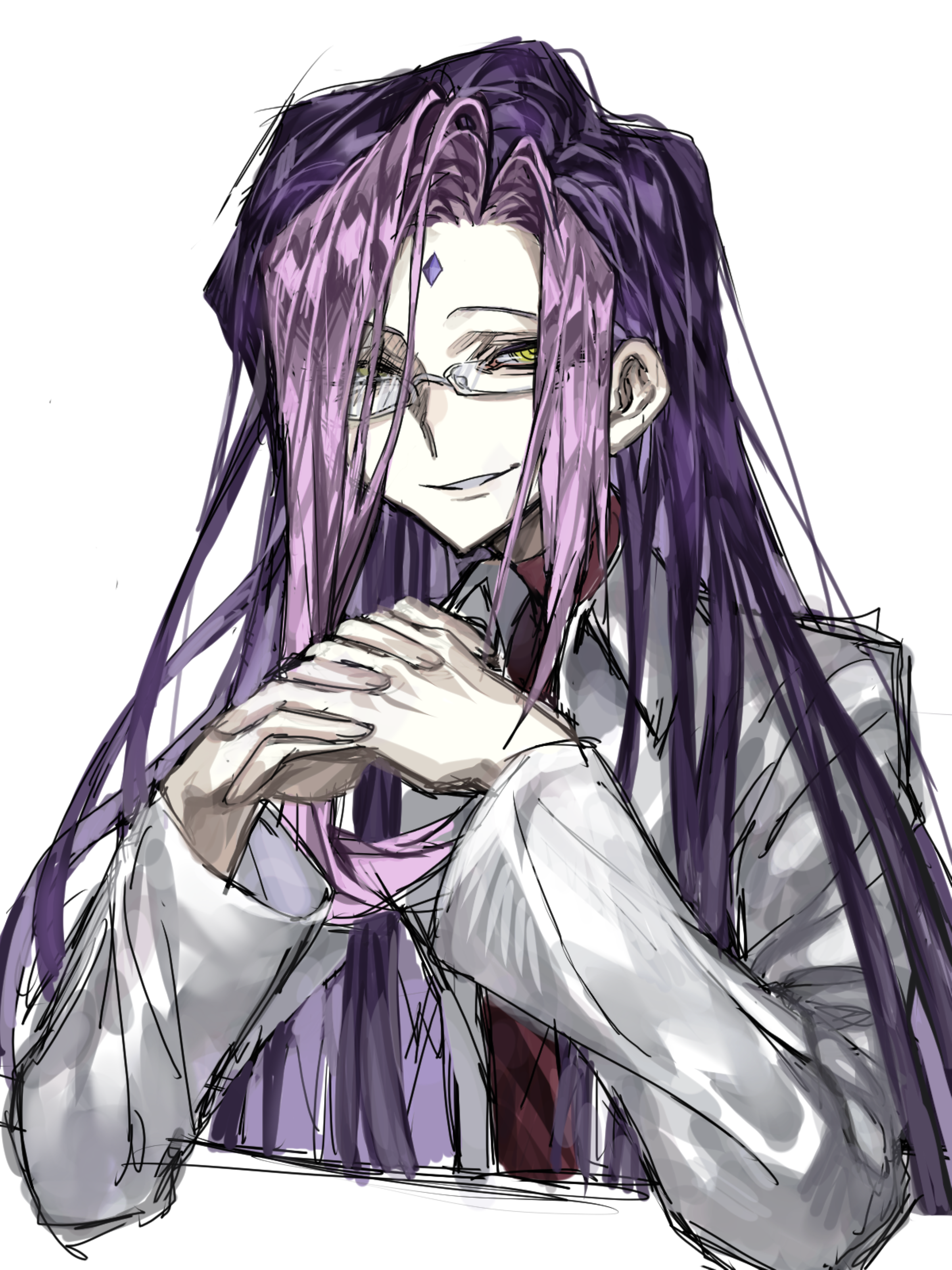 1boy absurdres chinese_commentary commentary_request facial_mark forehead_mark glasses grin highres jacket jcwlg long_hair long_sleeves male_focus odis_(screechers_wild) open_clothes open_jacket own_hands_together purple_hair red_shirt screechers_wild shirt simple_background sketch smile solo white_background white_jacket yellow_eyes