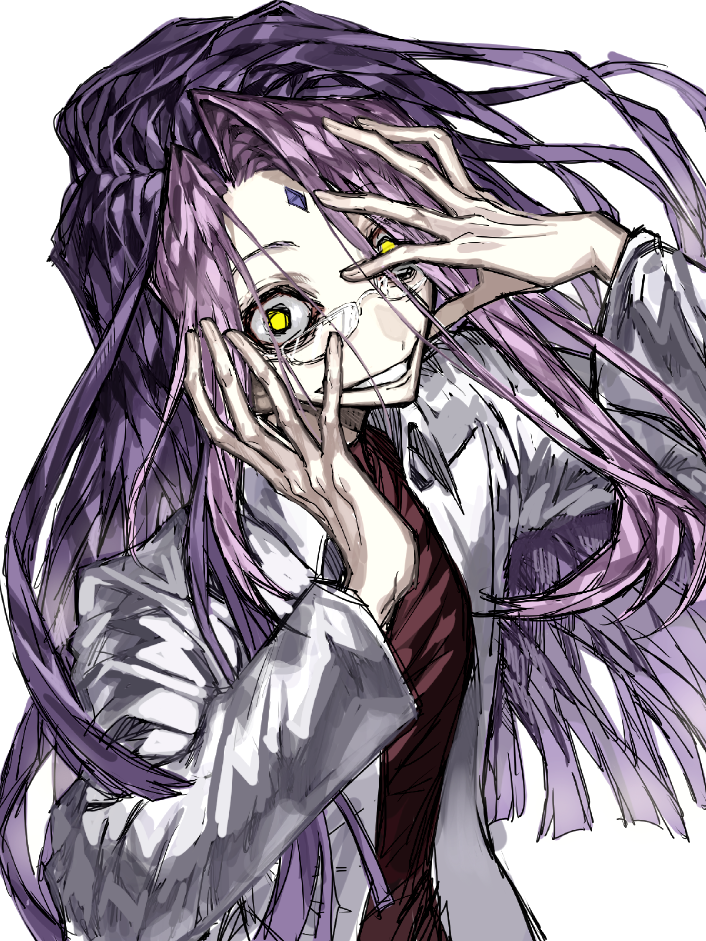 1boy absurdres chinese_commentary commentary_request constricted_pupils crazy crazy_eyes facial_mark forehead_mark glasses grin hands_on_own_face highres jacket jcwlg long_hair male_focus odis_(screechers_wild) open_clothes open_jacket purple_hair red_shirt screechers_wild shirt simple_background smile solo upper_body white_background white_jacket yellow_eyes