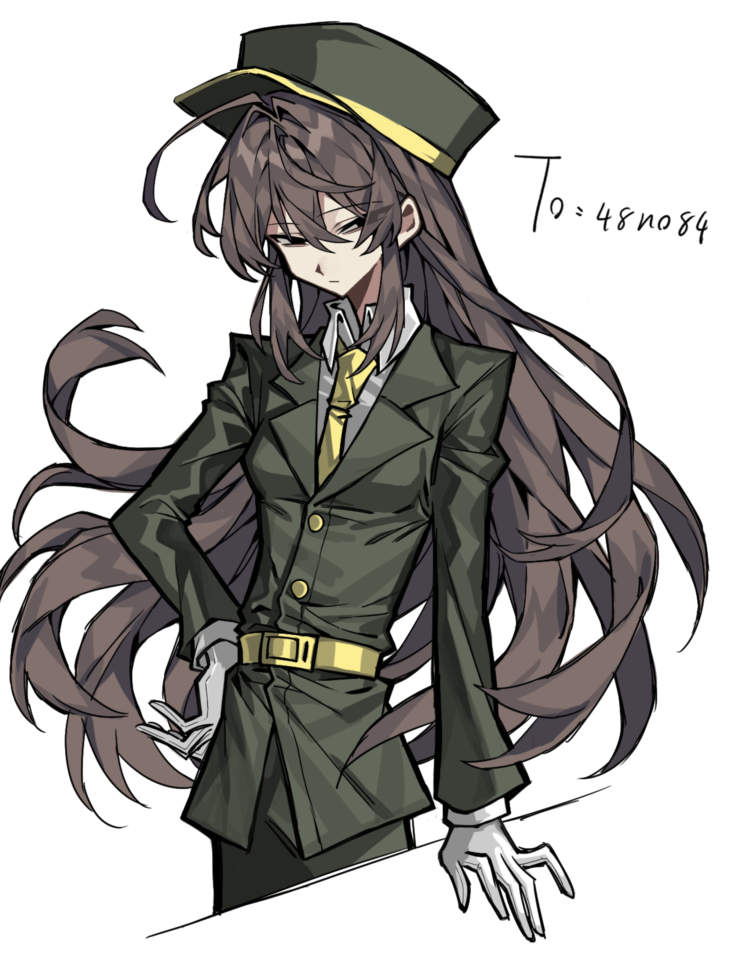 1girl absurdres belt black_eyes breasts brown_hair buttons character_request chinese_commentary closed_mouth collared_shirt commentary_request copyright_request cropped_legs expressionless eyes_visible_through_hair gloves green_hat green_jacket green_pants hair_between_eyes hair_intakes hand_on_own_hip hat highres jacket jcwlg long_hair long_sleeves necktie pants shirt sidelocks simple_background small_breasts solo very_long_hair white_background white_gloves white_shirt yellow_belt yellow_necktie