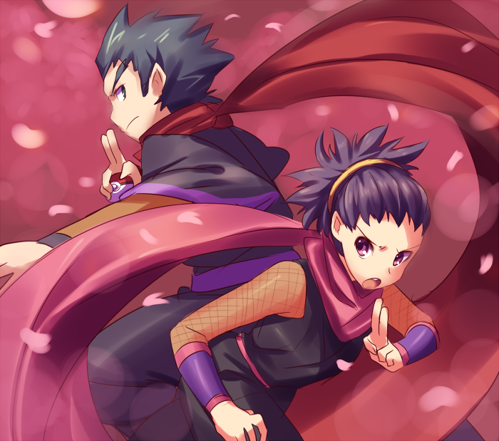 1boy 1girl black_jumpsuit black_pants father_and_child father_and_daughter fishnet_top fishnets grey_hair hair_tie holding janine_(pokemon) jumpsuit koga_(pokemon) long_scarf ninja nintendo open_mouth pants parent_and_child petals pink_scarf poke_ball poke_ball_(basic) pokemon pokemon_heartgold_and_soulsilver purple_eyes purple_hair purple_jumpsuit red_scarf scarf sleeveless_jumpsuit undershirt weee_(raemz)