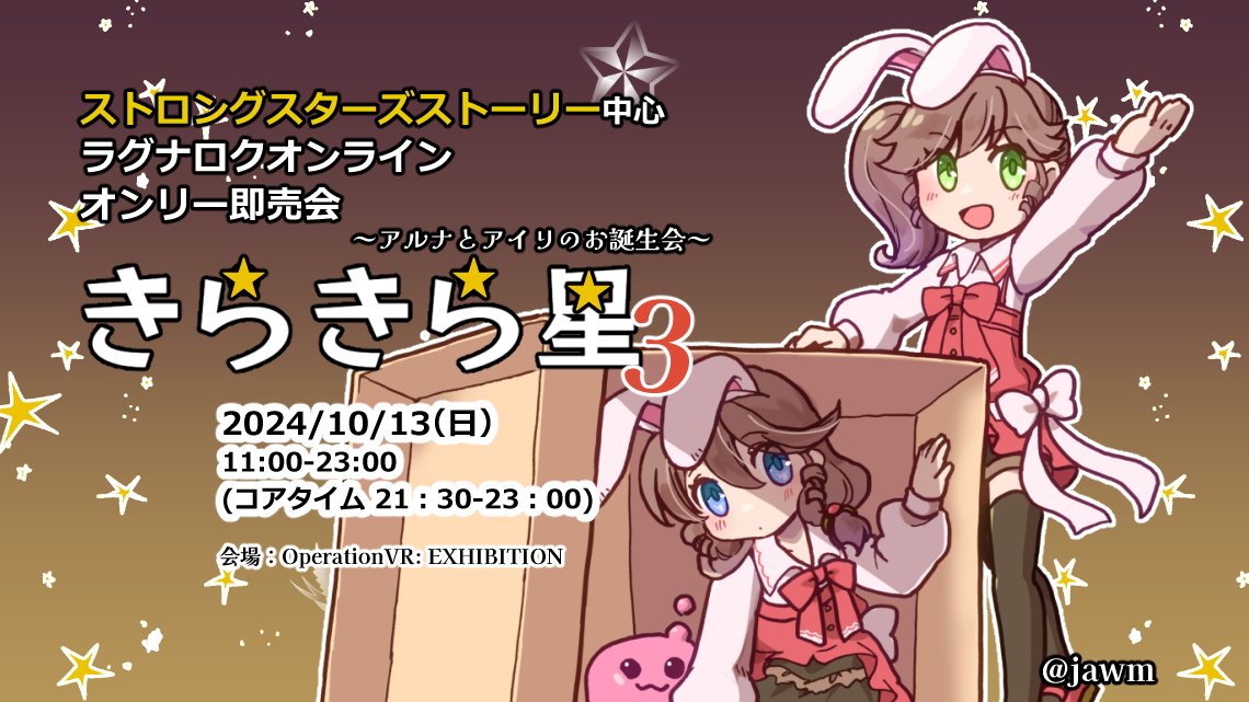 2girls airi_(ragnarok_online) animal_ears aruna_(ragnarok_online) blue_eyes bow brown_hair fake_animal_ears green_eyes jawm multiple_girls open_mouth poring rabbit_ears ragnarok_online red_bow ringlets siblings sisters star_(symbol) twitter_username white_bow