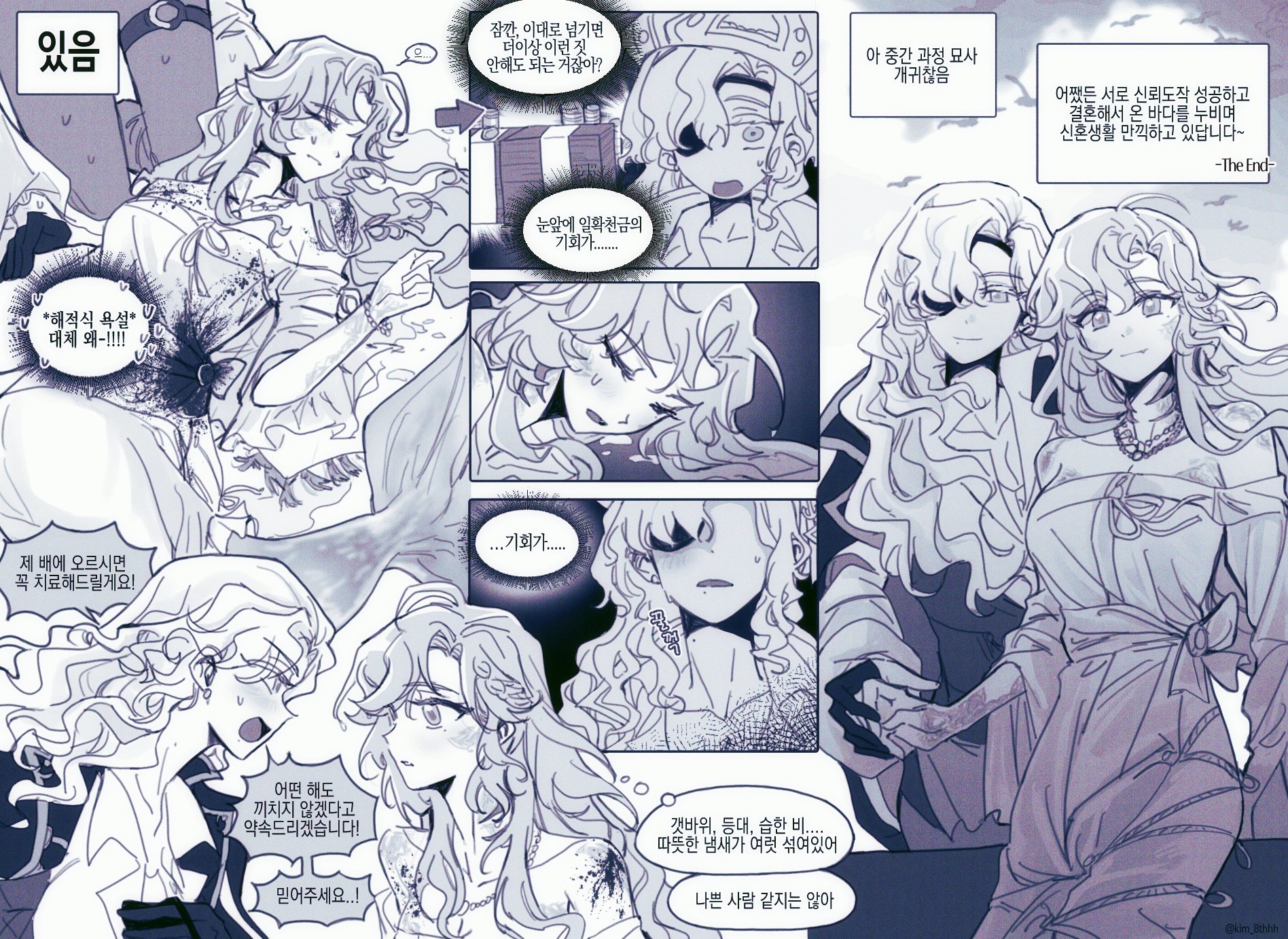 2girls alternate_costume banknote bare_shoulders coin collared_shirt curly_hair dress fang fang_out gloves highres holding_hands kim_8thhh korean_text long_hair long_sleeves lying mermaid mole mole_under_mouth money monochrome monster_girl multiple_girls multiple_views off-shoulder_dress off_shoulder on_back open_mouth reverse:1999 shirt smile speech_bubble sweat thought_bubble translation_request vest vila_(reverse:1999) windsong_(reverse:1999)