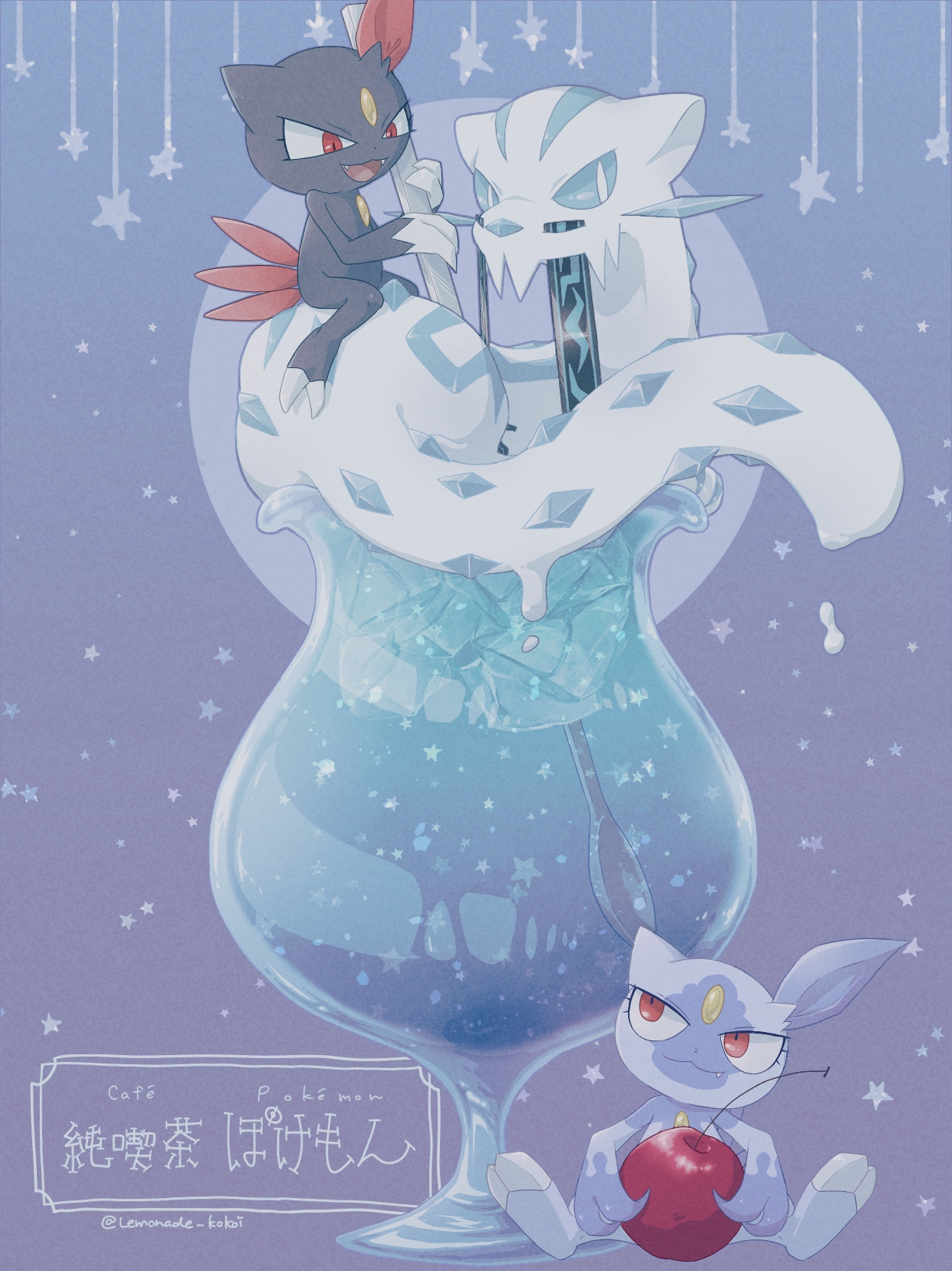 2others :3 animal_ears animal_feet animal_hands artist_name bilingual_text black_fur blue_sclera body_fur cherry chest_jewel chien-pao claws closed_mouth colored_sclera cup dessert drink drinking_glass dripping english_text fang fang_out fangs food food_focus forehead_jewel fruit furry gem gen_2_pokemon gradient_background grey_fur hands_up happy head_tilt highres hisuian_sneasel holding holding_food holding_fruit holding_spoon ice_cream ice_cream_float in_food japanese_text lemonade_kokoi looking_up mixed-language_text multiple_others multiple_tails nintendo open_mouth oversized_food oversized_object pokemon pokemon_(creature) purple_background red_eyes signature sitting slit_pupils smile sneasel spoon spread_legs star_(symbol) straight-on tail twitter_username two-tone_fur white_eyes yellow_gem