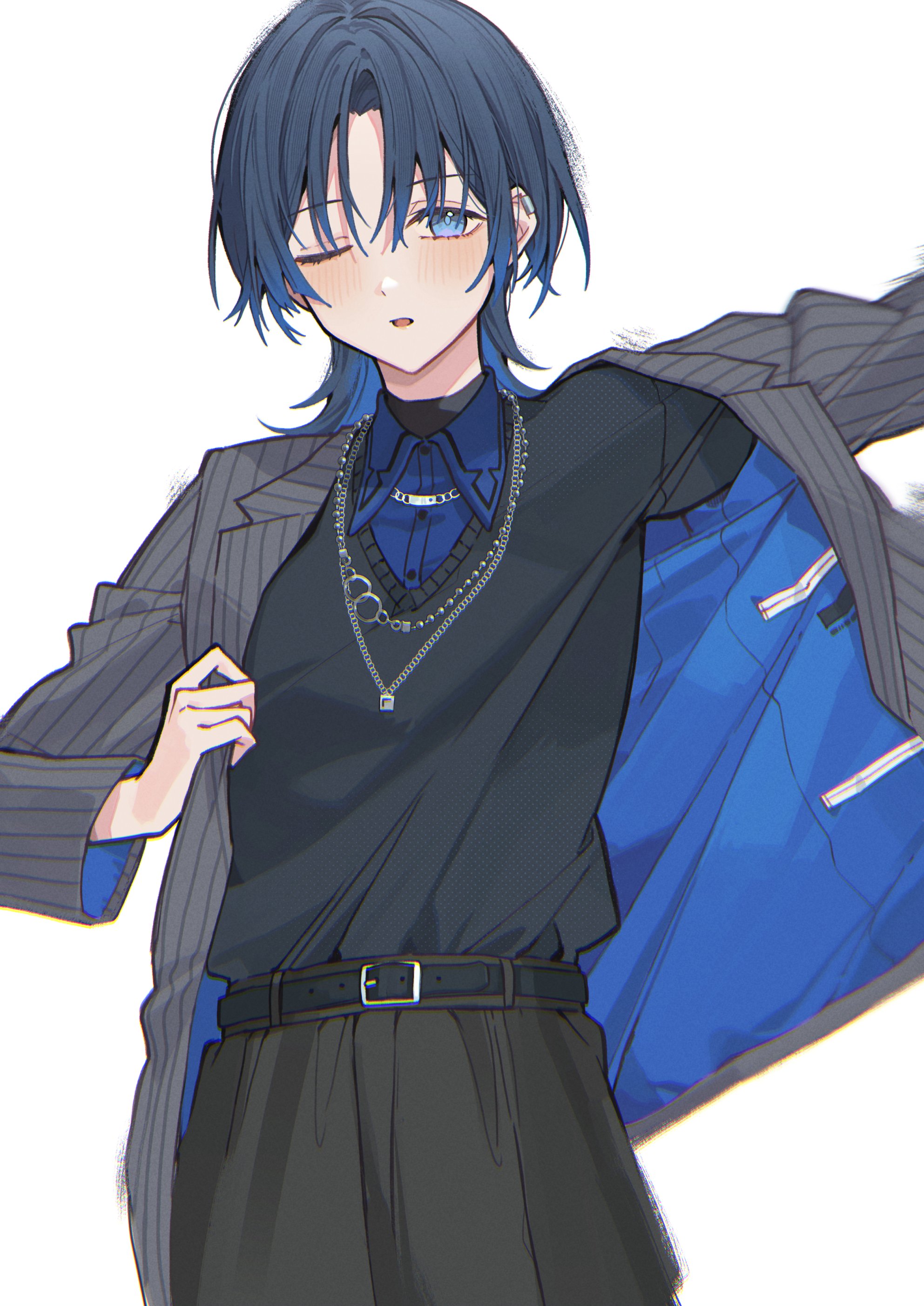 1girl absurdres belt black_pants black_sweater blue_eyes blue_hair blue_shirt blush collared_shirt dressing earclip flat_chest grey_jacket highres hiodoshi_ao hiodoshi_ao_(1st_costume) hololive hololive_dev_is jacket jewelry long_sleeves looking_at_viewer medium_hair necklace one_eye_closed open_mouth pants parted_bangs shirt sidelocks simple_background solo sweater sweater_vest tsukino_(nakajimaseiki) turtleneck undershirt upper_body virtual_youtuber white_background